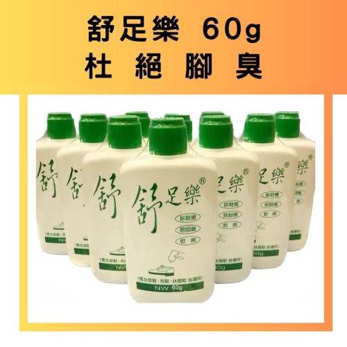 舒足樂鞋粉可有效杜絕腳臭、鞋臭及鞋內濕癢等不適,讓您腳底乾爽舒適,歡樂無憂。 (現貨供應,請直接下標) 使用方法:每隻鞋倒入1/2瓶蓋。 成分 : 乾燥粉、石粉、香料。 容量 : 60 g 不管鞋子多溼,只要穿鞋前加入舒足樂,自能消除潮溼所引起之臭味及腳癢,回家也不用再塞報紙到鞋子裏了,也不必再用吹風機將鞋子吹乾。居家備有舒足樂,則全家人將不必再為穿鞋而煩惱。 🌀舒足樂產品特性 除腳臭、除鞋臭、殺菌、止癢,將穿鞋所產生的臭味徹底消除。 不管鞋子多溼,都能保持鞋內乾燥清爽。 具殺菌功能,能止腳癢。 中和並吸收腳汗形成無色、無味、無害之代謝物。 無任何副作用,消費者可安心使用。 本產品在國家標準分類屬清潔用品類(非屬藥類)。 舒足樂正確使用方法 / 以綠色蓋子為杯,將舒足樂倒入一杯量,再將此一杯量平均倒於一雙鞋子內。 舒足樂倒入鞋底後,將鞋子搖一搖,使其均分佈於鞋底,效果更佳。 🍋初次使用最好能每日連續使用,至腳底乾燥清爽無惱人異味後,則可間隔數日使用一次。 ✅使用一天後發現襪底白白的,則是用量過多,可減量來使用。 ✅若連續使用三天效果不佳,則加重使用量即可。