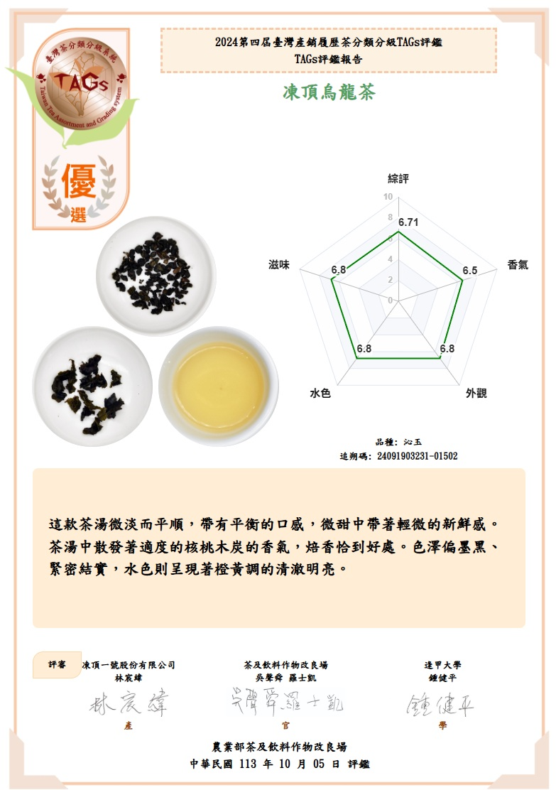 經由TAGs評鑑為優選的焙香沁玉烏龍