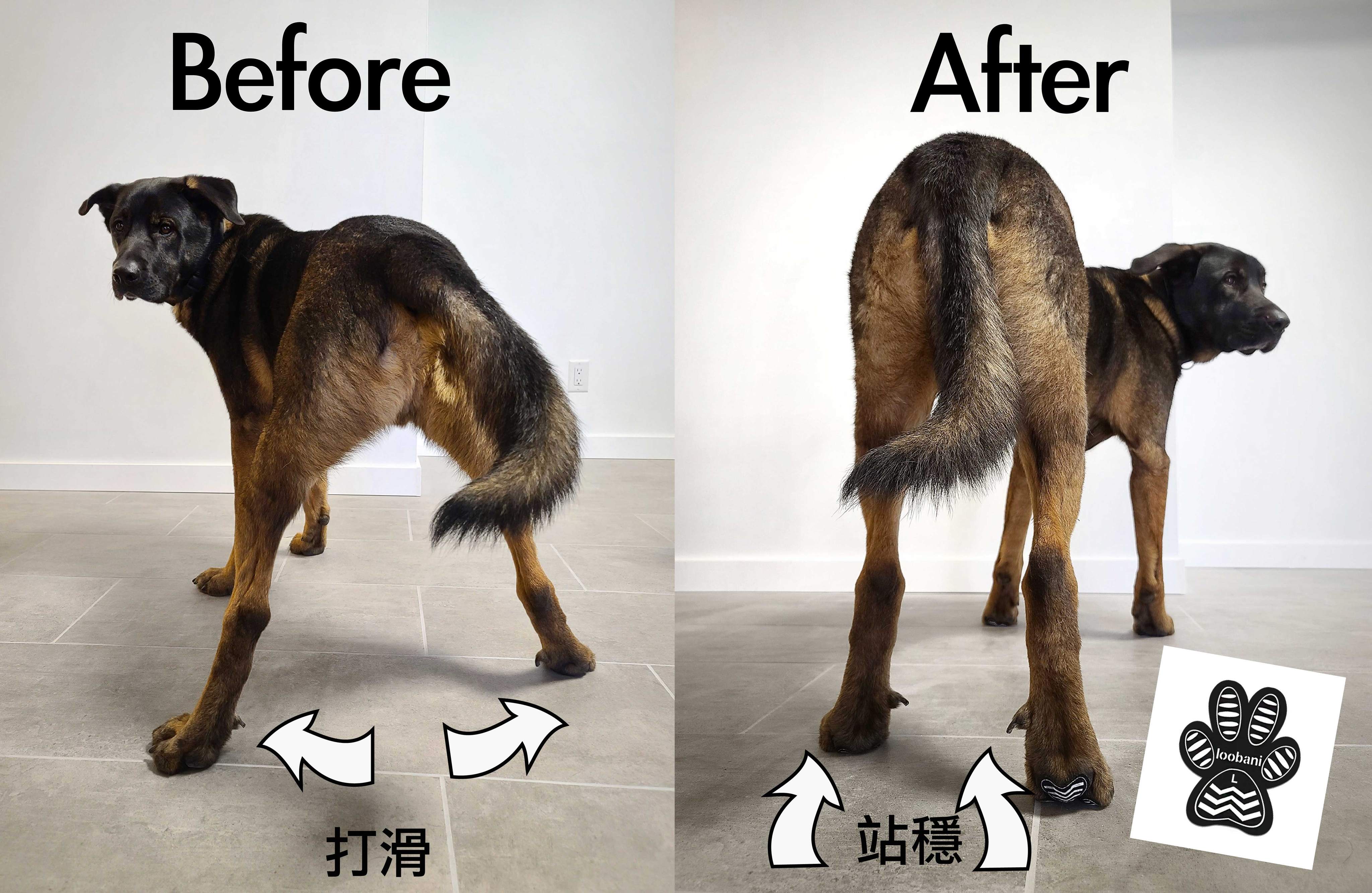 Loobani狗狗止滑貼,像OK繃般容易使用,只需黏貼在於狗狗肉球上,止滑貼上的矽膠止滑點,就能在肉球與地面間提供足夠的阻力,來支撐狗狗的肢體活動,達到防滑止滑的效果.