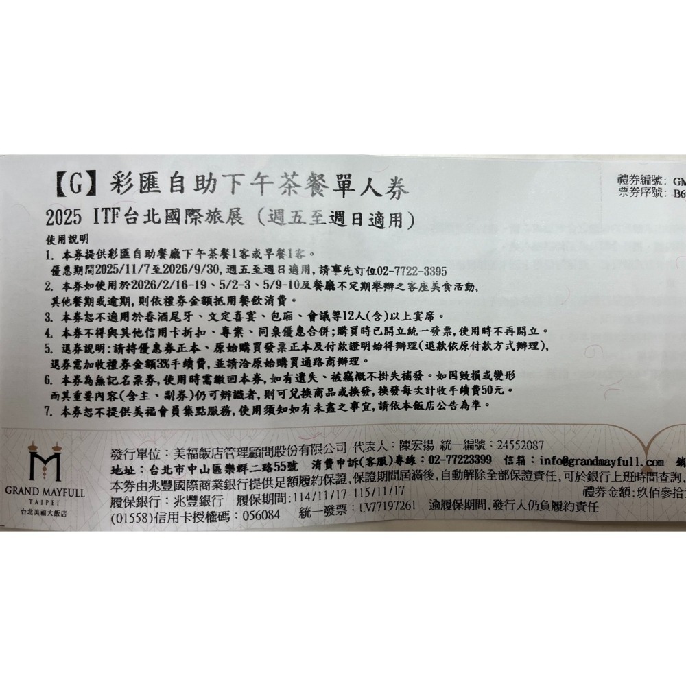 1. 本券提供彩匯自助餐廳週五至週日適用下午茶餐1客或早餐1客,優惠期間至2026/09/30,逾期依禮券金額抵用餐飲消費,請事先訂位02-7722-3395。