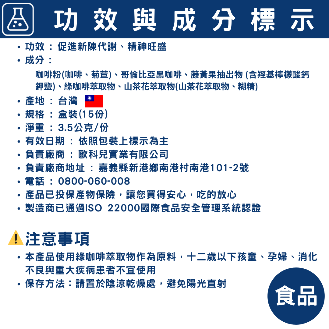 🌟【歐科兒-頂級綠咖啡 沖泡飲】15入|台灣製|哥倫比亞黑咖啡·藤黃果·山茶花·綠咖啡·促進新陳代謝·精神旺盛