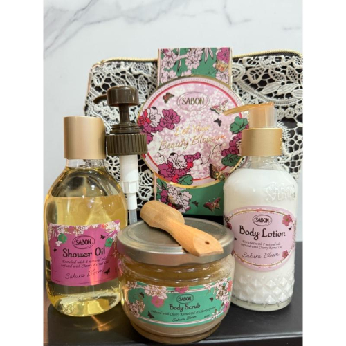 購買地點:板橋大遠百 SABON「花霞之境系列」的前調採用帶有綠草葉氣息的綠香調;中調的核心花香氣息,則猶如漫天飛舞的櫻花灑落,圍繞著牡丹與紫羅蘭的馥郁氣息,為粉色櫻花疊加出層次感;後調融入鳶尾、雪松、洋茉莉,將飄落的櫻雪靜靜擁入大地懷抱,留下餘韻繚繞的美好印象。 1.SABON 花霞之境沐浴油300ml 2.SABON 花霞之境身體磨砂膏320g 3.SABON 花霞之境身體乳液200ml 4.SABON 花霞之境化妝包