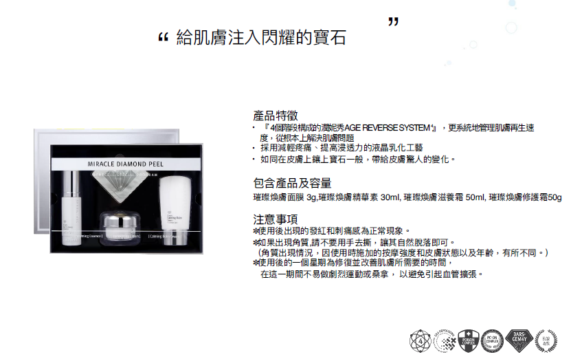 韓國原裝進口的鑽光煥膚組,結合前導精華、滋養霜與修護霜,採用液晶乳化技術,層層滲透保濕,給予肌膚珍貴呵護。質地柔潤細緻,幫助肌膚改善粗糙暗沉,打造透亮光澤感。適合定期深層護理,讓肌膚彷彿重獲新生,重現閃耀質感。