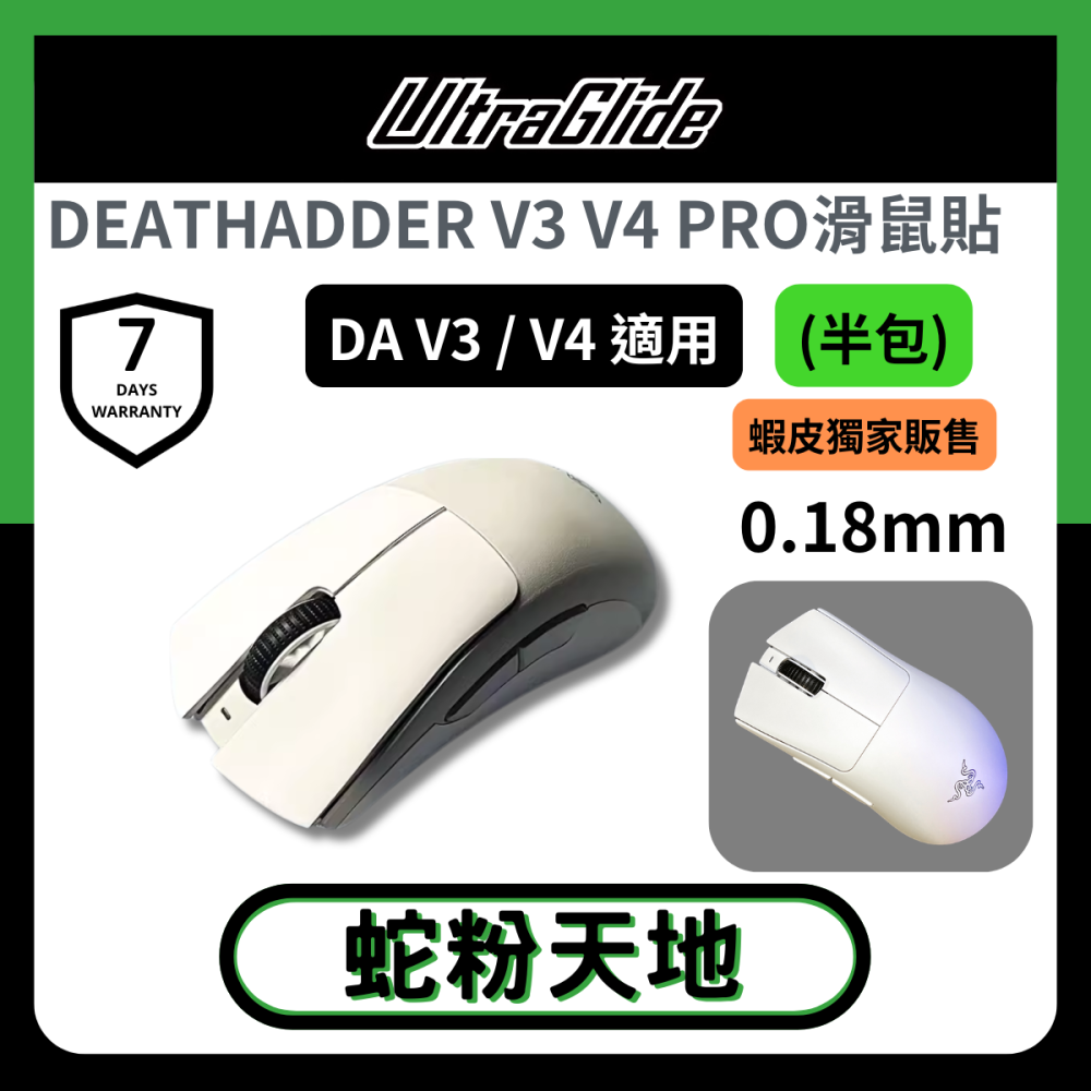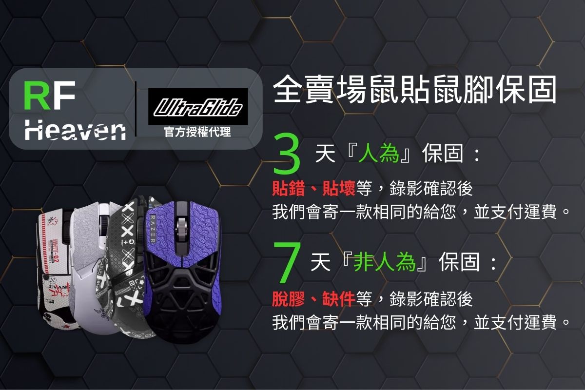 🐍RFH蛇粉天地🐍【UltraGlide】Razer DeathAdder V3 Pro 雷蛇滑鼠防滑貼010 極致輕薄 🐍全新未拆,店家3天人為保固,7天非人為保固🐍 https://s-cf-tw.shopeesz.com/file/tw-11134208-7rasg-m58755fbqmkt88 https://s-cf-tw.shopeesz.com/file/tw-11134208-7rasl-m58755fbs15926 https://s-cf-tw.shopeesz.com/file/tw-11134208-7r98z-lw7dgs9mhs869f https://s-cf-tw.shopeesz.com/file/tw-11134208-7rasj-m5y27p5ve1smc7 https://s-cf-tw.shopeesz.com/file/tw-11134208-7r98z-lw7dgs9mj6sma9 https://s-cf-tw.shopeesz.com/file/tw-11134208-7r98x-lw7cy4alszzk6b https://s-cf-tw.shopeesz.com/file/tw-11134208-7r98o-lxkixisx9r1sa7 【UltraGlide 頂極絲滑】 專為玩家所生的品牌,RFH蛇粉天地臺灣獨家代理 與雷蛇原廠合作,0誤差的精準開模技術 使用最頂級的材料製作,用心全都看的見 還不確定要用哪些鼠貼鼠腳嗎? 【UltraGlide】,會是你的最佳解答 ------------------------------------------------------------------------------------------------------------------------------------------------------------------------------------------------------- 商品特色: 📌與雷蛇原廠合作,精準開模0誤差 📌材質: ➡️ 0.18 mm 極緻輕薄,競技專用 📌材質 : 『3M背膠』以及『SGS認證臺灣PU』,安全無毒,精準好貼 📦內容物 : 鼠貼、鑷子、除膠貼、酒精濕布 ------------------------------------------------------------------------------------------------------------------------------------------------------------------------------------------------------ ❗❗注意事項❗❗ 1️⃣ 這『不是滑鼠賣場』,請確認好所需型號再下單。 2️⃣保固: 【3天人為保固】: 貼錯、貼壞等,皆可拍照錄影確認 【7天非人為損害保固】: 脫膠、缺件等,皆可拍照錄影確認 若符合保固,請和賣家聊聊後,提供賣家寄件地址, 我們會為您寄出一款相同的滑鼠防滑貼。 3️⃣黏貼步驟: 1.先拿滑鼠貼比一下各個貼片的位置 然後用酒精棉擦乾淨滑鼠表面 等乾燥後將滑鼠貼對準滑鼠貼上 2.只要將滑鼠貼對齊一面(優先不規則邊) 輕輕貼上(沒對齊可撕下重貼) 3.再輕輕拉平滑鼠貼其他面的幾個角 確認沒問題再按壓牢固 4.最後將表層的保護膜撕開就完成了 4️⃣防滑貼日常保養: 勤洗手,用完後用濕巾擦拭 盡量不要用含酒精等腐 蝕類擦拭。(會破壞皮層) 防滑貼使用後會一直吸入汗漬污漬變黑,建議選擇黑色深色。 ------------------------------------------------------------------------------------------------------------------------------------------------------------------------------------------------------ ▶️退換貨須知 商品到貨隔日享7天鑑賞(猶豫)期之權益【鑑賞(猶豫)期非試用期】,辦理退貨商品必須是全新狀態且包裝完整,否則將會影響退貨權限。 📣3C相關商品,為一次性包裝商品,不可拆封或試用,請務必確認有購買需求後再拆封。  ※以上說明,若有不符請通知我們,先以原廠官方網站為主,不便之處敬請見諒! 🔴REC "拆封請全程錄影" 為保障雙防權益,請您在開箱過程中務必全程錄影。 以確保商品是否有 "遺漏、記錯、缺貨、瑕疵品"等,請皆以「完整錄影檔」為依據,並跟我們連繫! ❌請勿用評價代替溝通❌ 有任何問題歡迎直接與我們聯繫,我們會全力為您服務 如果喜歡我們的商品及服務,歡迎給我們★★★★★五顆星好評肯定唷~