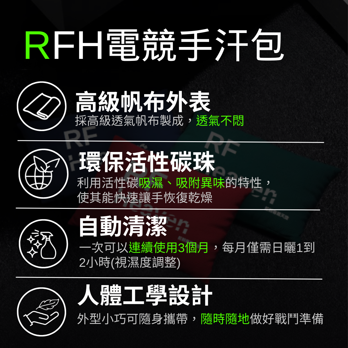 1️⃣ RFH電競手汗包由高級帆布以及活性碳珠材質製成。若不慎破裂,請勿食用,並嚴禁孩童把玩。