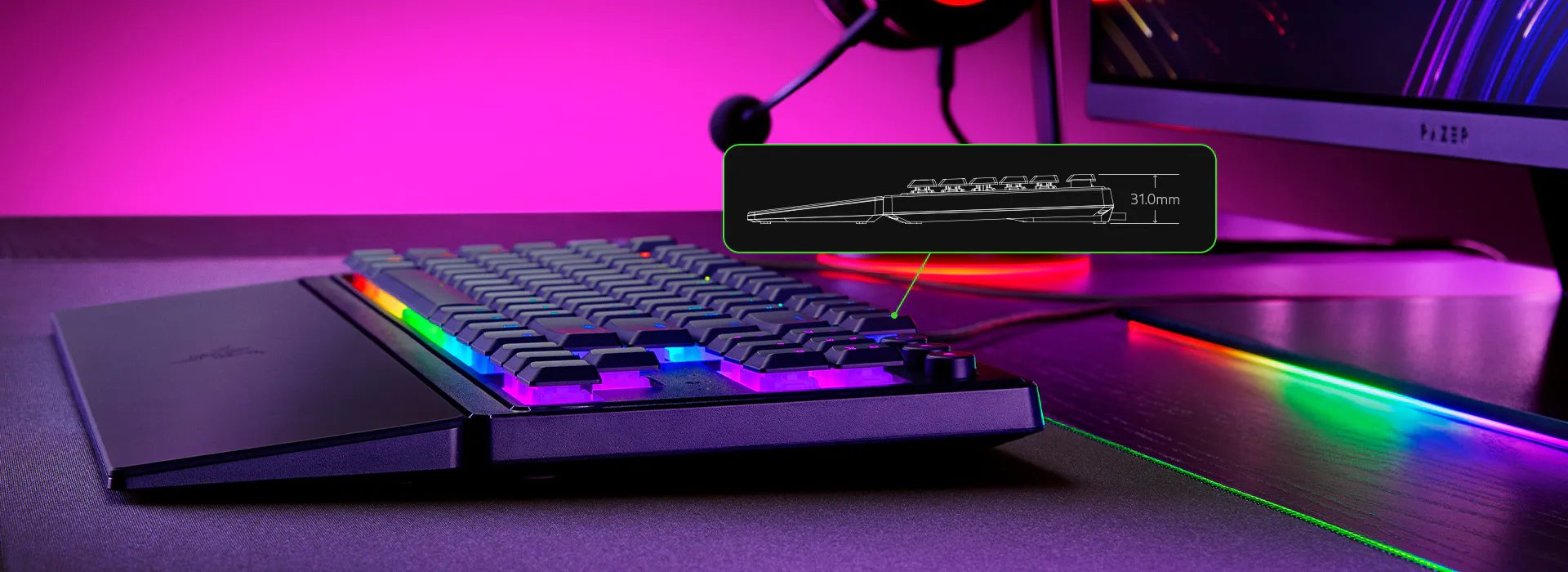 採用超纖薄外型設計和獨特 Razer™ 機械式薄膜按鍵軸,這款小巧的混合式鍵盤能提供無比高超的能力,