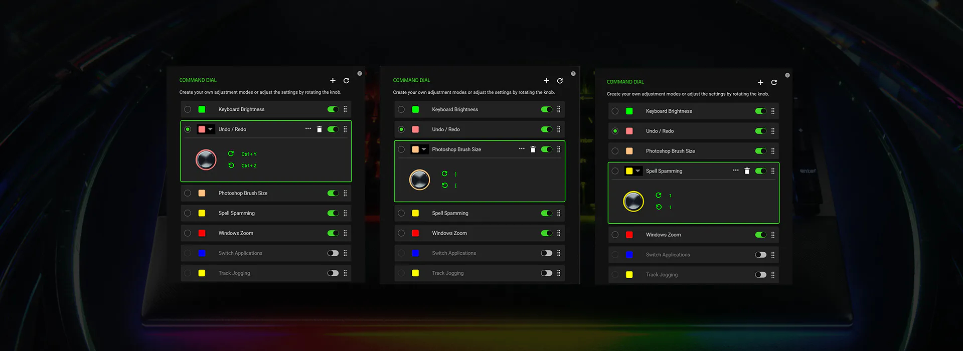 使用 Razer Synapse 建立和儲存最多 100 種模式。指定自訂模式的專屬背光,並將旋鈕的順時針和逆時針轉動對應至任何功能。