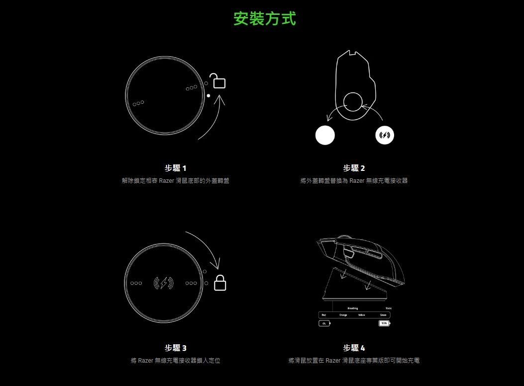 讓充電無比直覺輕鬆。只要將無線充電接收器安裝在相容的 Razer 滑鼠上,接著放上底座,就能在充電同時確實固定。