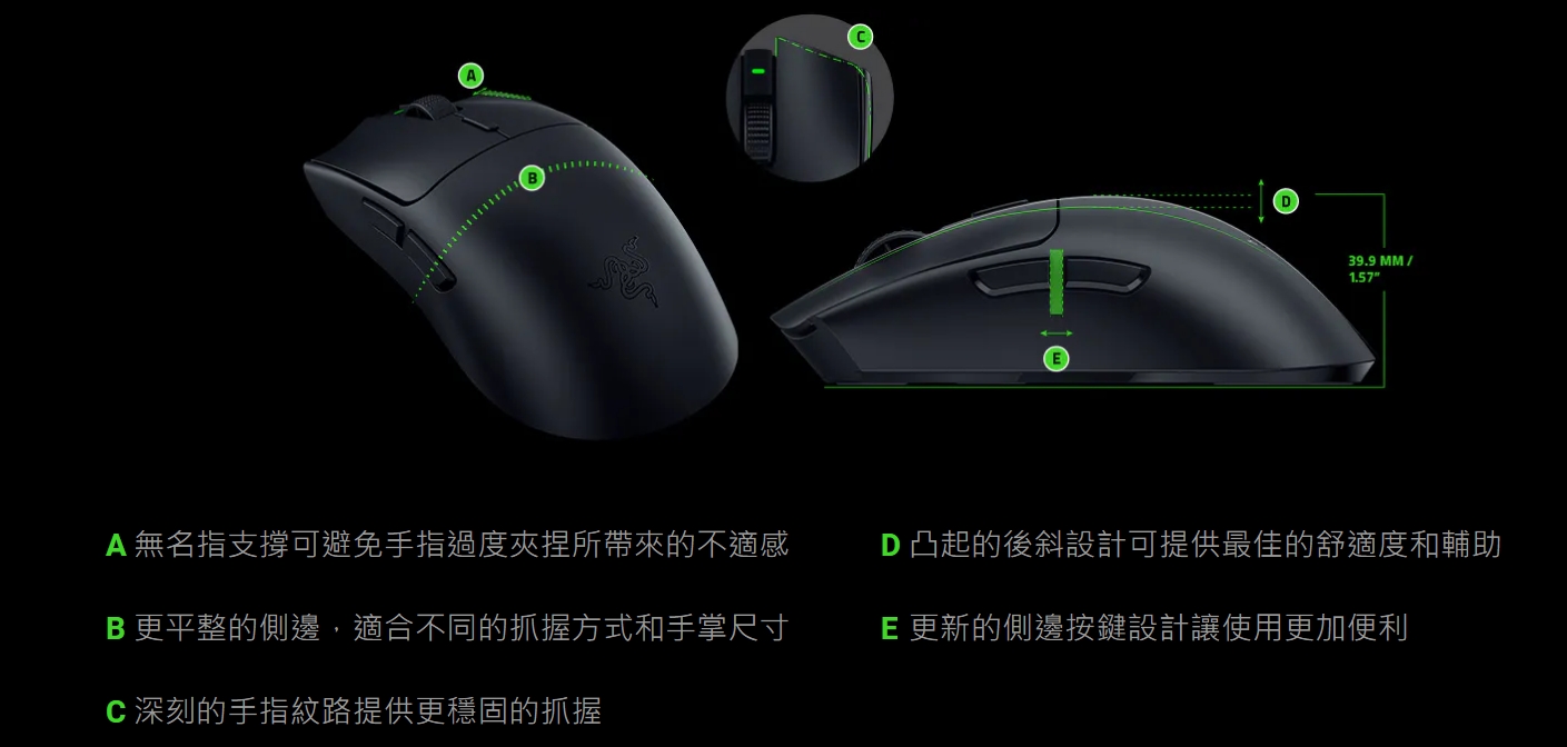 隨著電競逐步發展,我們對滑鼠設計的思維模式同時也在不斷變化。為了滿足職業電競選手近期的喜好,我們與最傑出的選手攜手合作,並汲取前代 Viper 的經驗,進而呈現以功能性和舒適度為基礎的全新外型設計。