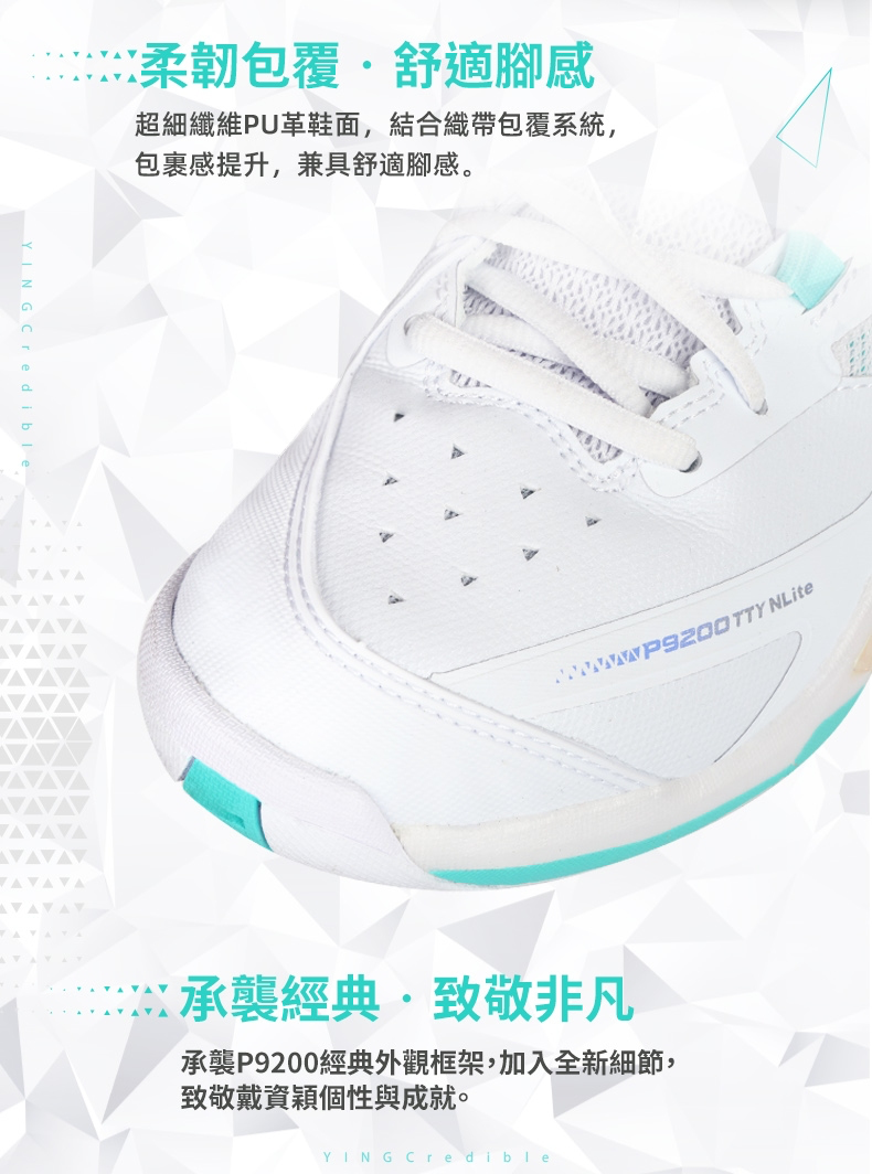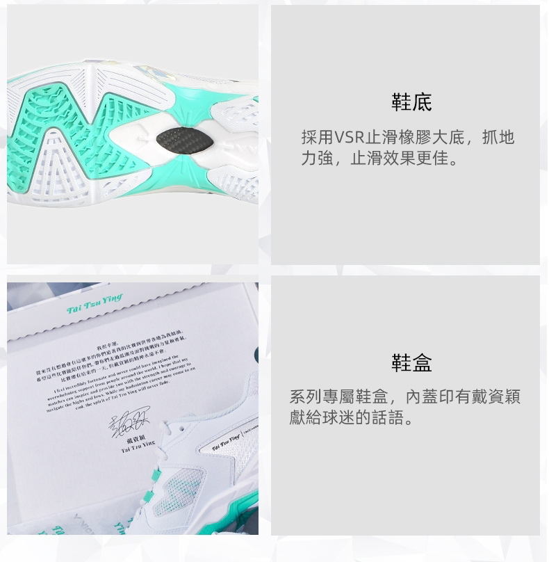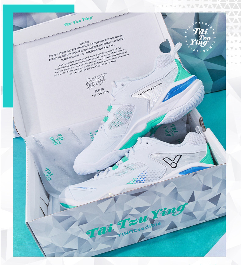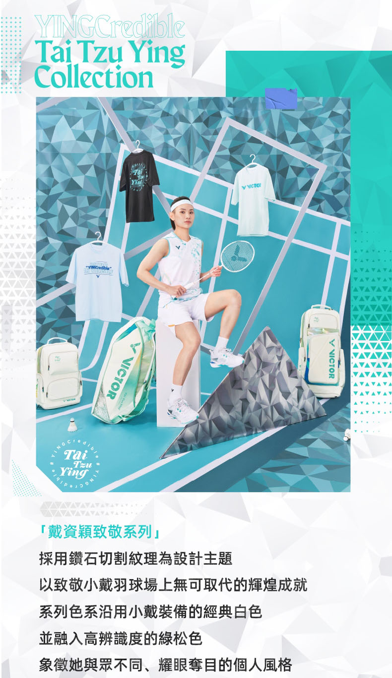 「YINGcredible - 戴資穎致敬系列」採用鑽石切割紋理為設計主題,以致敬小戴羽球場上無可取代的輝煌成就。系列色系沿用小戴裝備的經典白色,並融入高辨識度的綠松色,象徵她與眾不同、耀眼奪目的個人風格。