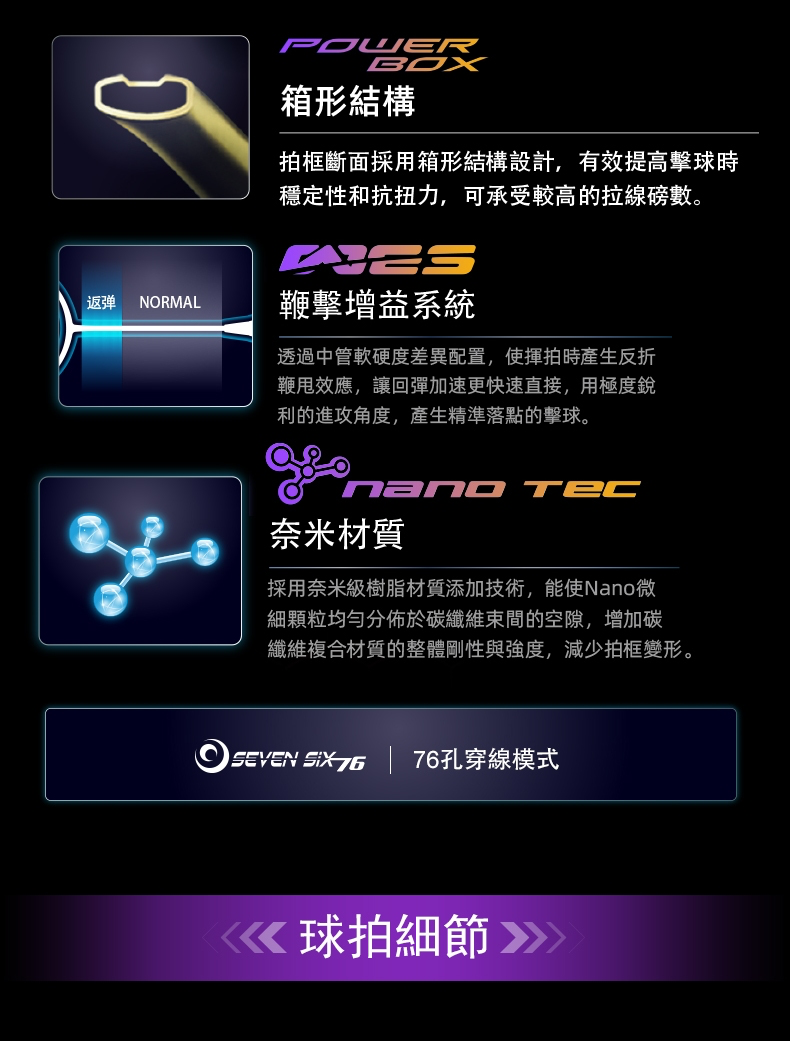 延續龍牙之刃血統,箱型拍框注入進攻拍基因。鞭擊增益系統結合懸浮核心科技手柄,爆發突擊性能,上手更輕鬆。