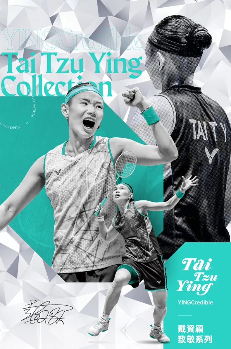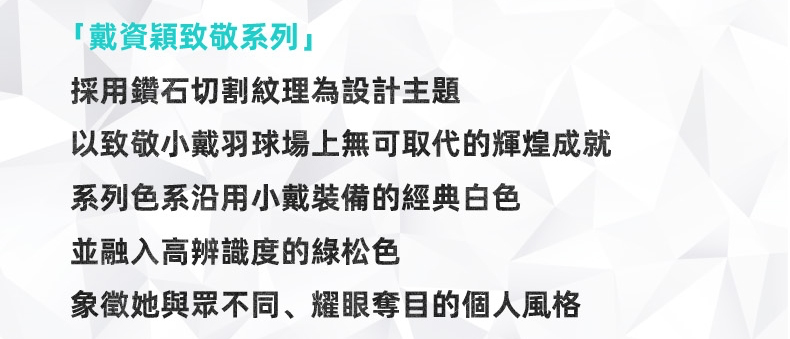 「YINGcredible - 戴資穎致敬系列」採用鑽石切割紋理為設計主題,以致敬小戴羽球場上無可取代的輝煌成就。系列色系沿用小戴裝備的經典白色,並融入高辨識度的綠松色,象徵她與眾不同、耀眼奪目的個人風格。
