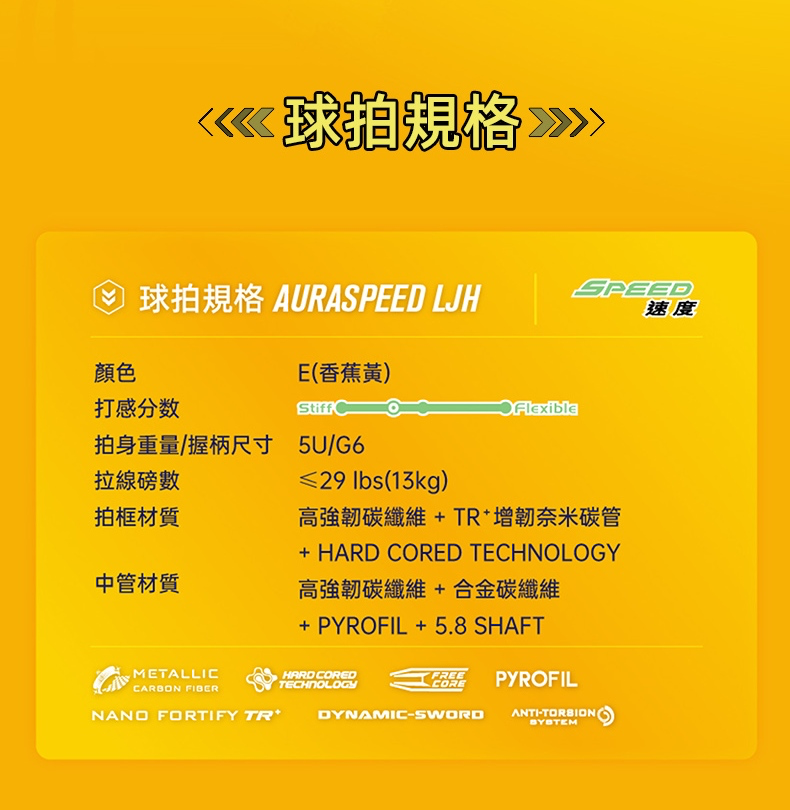 拍框材質:高強韌碳纖維+TR*增韌納米碳管+HARD CORED TECHNOLOGY