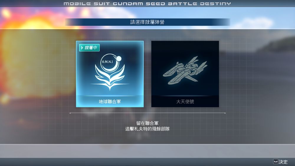 在收錄了多種重現原作名場面的任務以及原創任務的「故事任務」中,玩家將從地球聯合軍、札夫特、大天使號等3大勢力中選出隸屬的勢力,與原作的人氣角色一起戰鬥或是與之敵對,親身體驗C.E.的戰場。
