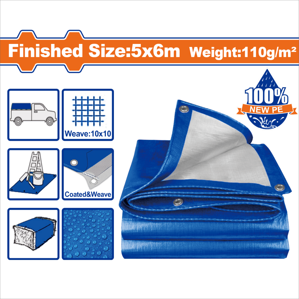 聚乙烯尺寸:5m*6m(英尺:16.4x19.6) 材質:100%全新PE 重量:110g/m2 編織:10*10 網厚度:0.15mm每100公分有鋁製索環,方便係緊兩面都採用100%全新PE層壓和塗層 非常適合防水;防雪、防塵、防紫外線 |