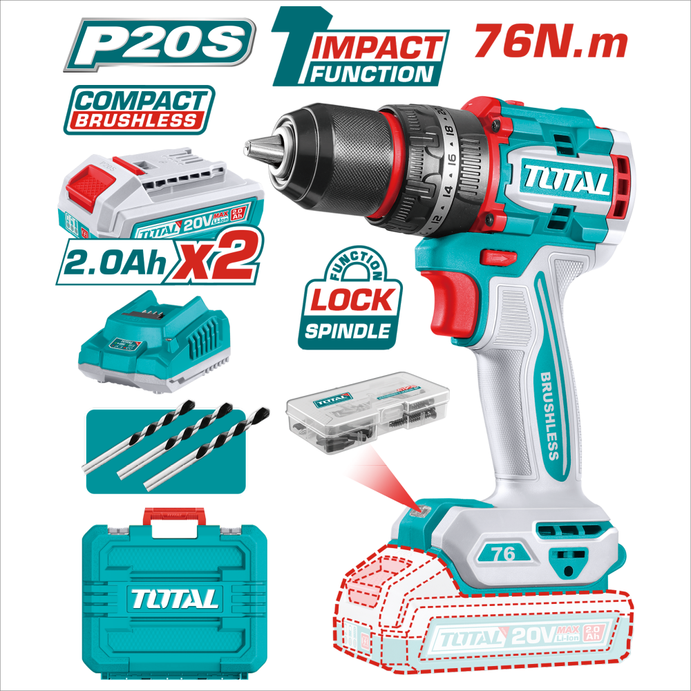 | 無刷電機 電壓: 20V 空載轉速:0-500/0-2000rpm 最大衝擊率:30000bpm 最大扭力:76Nm 金屬夾頭 夾頭容量:1/2" 扭力設定:22+1+1 機械雙速齒輪 主軸鎖定功能 整合式 LED 工作燈 LED 電池電量指示器 包括: 2 個 2.0Ah 電池組(TFBLI20011) 1 個充電器(UTFCLI2001) 充電電壓:110-120V~50/60Hz 47 件配件 3 件石工鑽頭 用手提箱包裝 |
