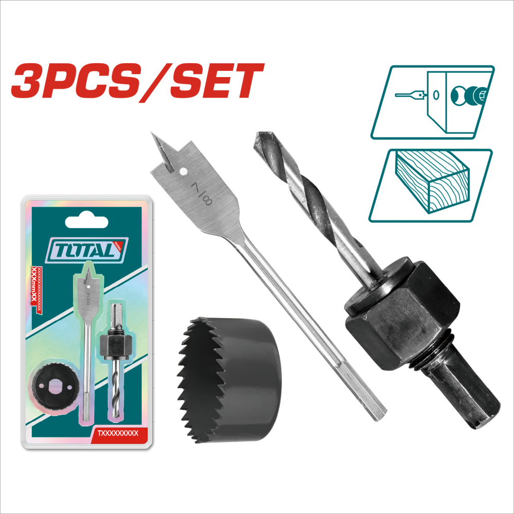 | 3件/套 1 件 54 毫米碳鋼孔鋸 1 件 3/8 英吋孔鋸軸 1 件 7/8 英吋扁木鑽頭 雙泡罩包裝 |