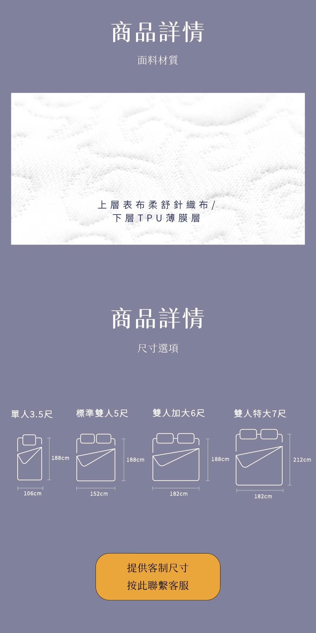 106公分×188公分(3.5×6.2尺)/可包覆床墊厚度約30公分