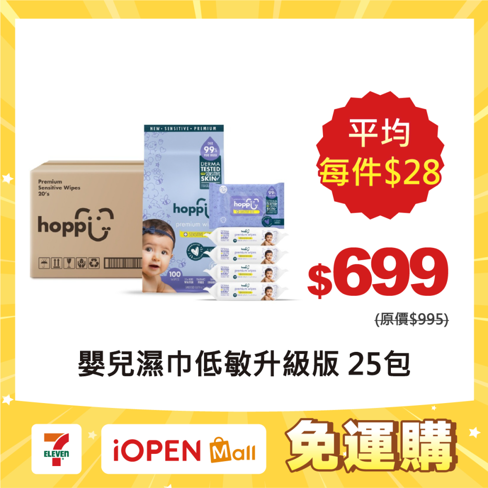【7-ELEVEN門市團購】Hoppi嬰兒口手適用純水濕紙巾(低敏升級版)20抽_一袋5包x5袋(箱購)