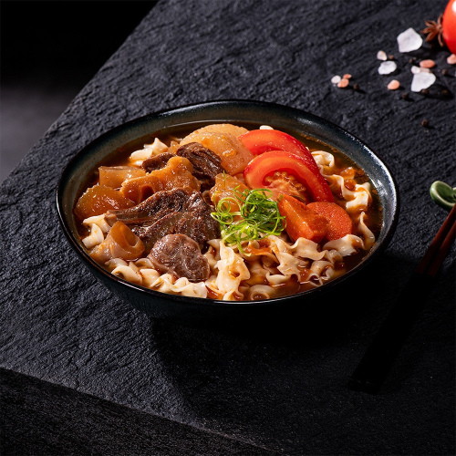 選用牛腱心,筋多肉質堅實,富含膠原蛋白。經高溫高壓燉煮,牛腱肉軟嫩入味。祖傳秘方加以創新,湯頭酸甜清爽,融入牛肉精華,並加入新鮮牛番茄,讓湯頭更加溫潤酸甜。這款牛肉麵展現台灣道地風味,無論何時何地,都能輕鬆享用極致美味。