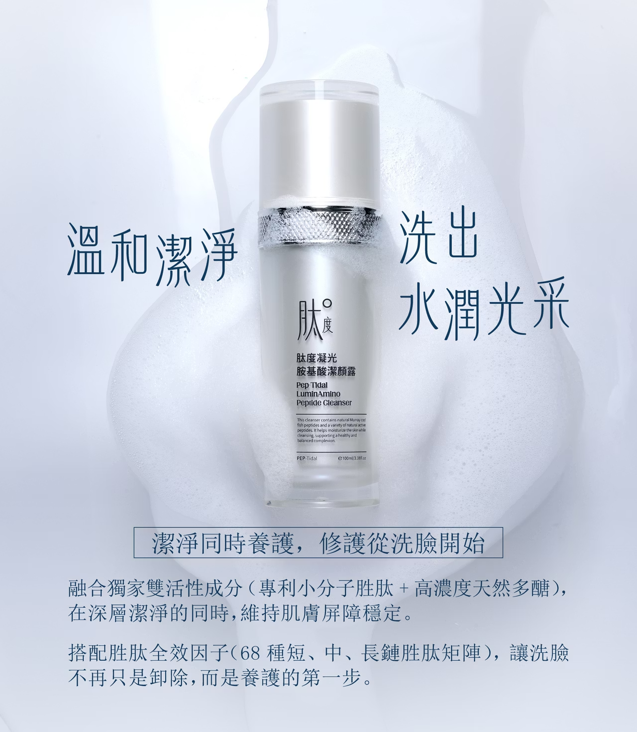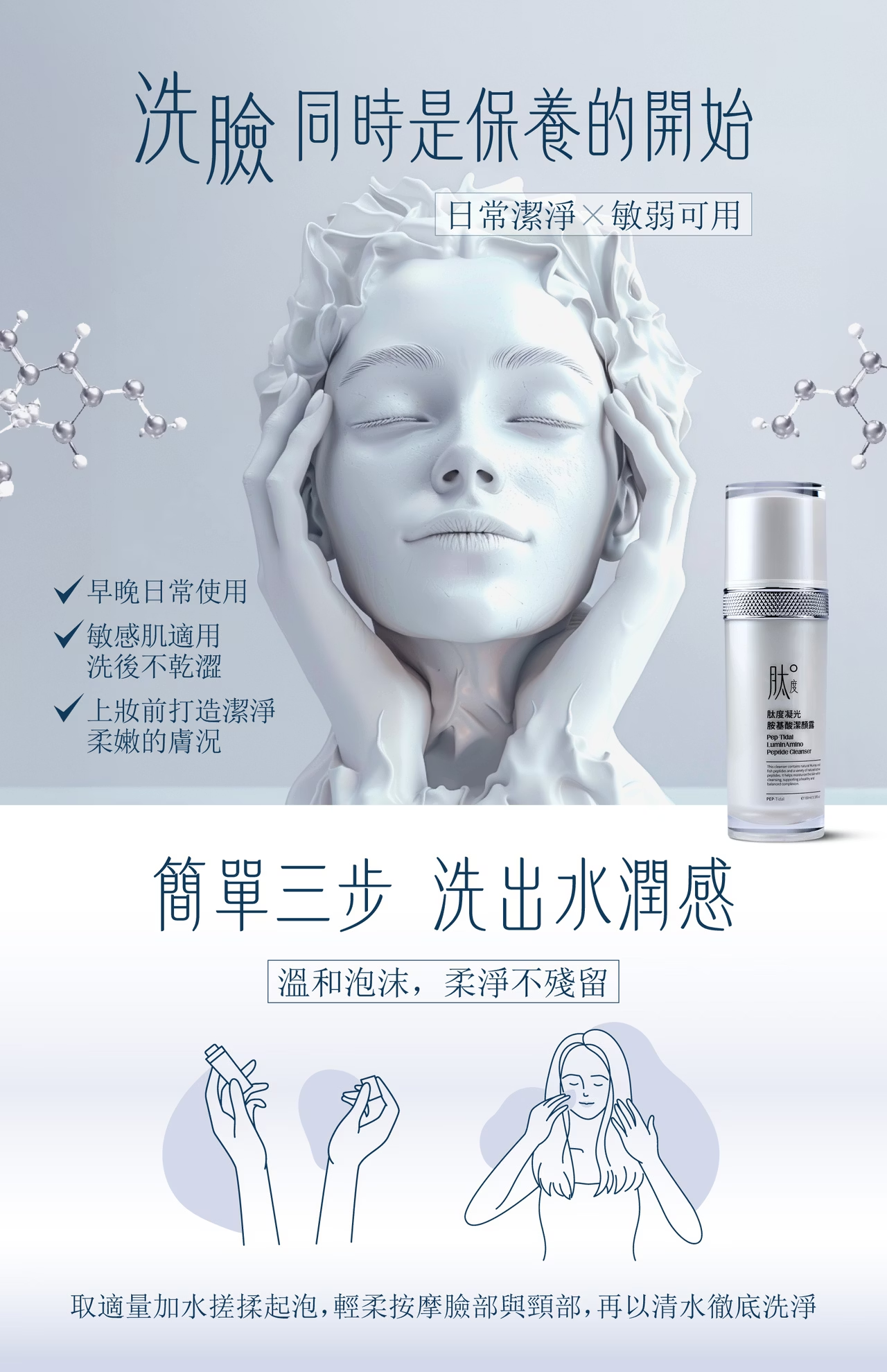 取適量塗抹於微濕的雙手,輕柔按摩臉部與頸部肌膚,接著以溫水徹底洗淨。