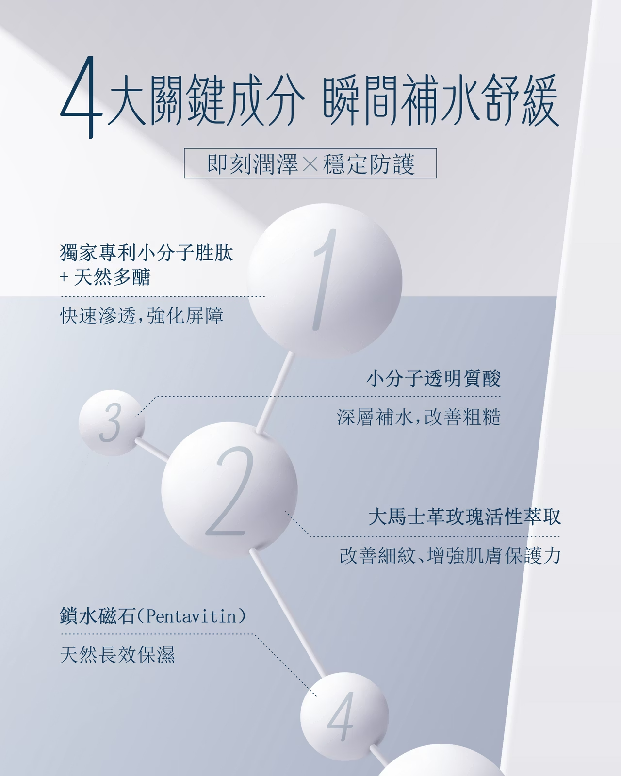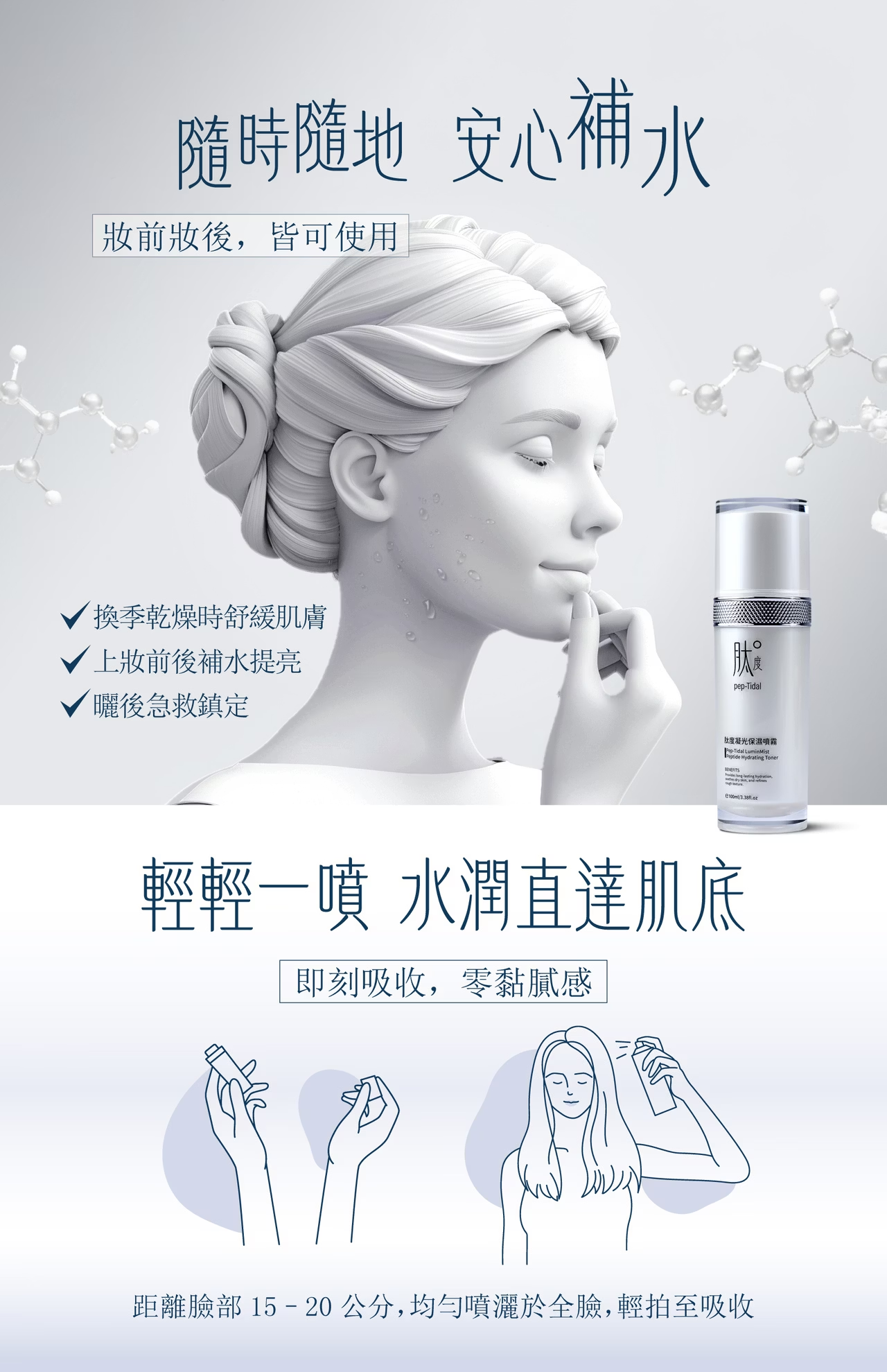 距離臉部約15-20公分,以Z字型均勻噴灑於臉部,停留一分鐘後,輕輕拍打吸收。