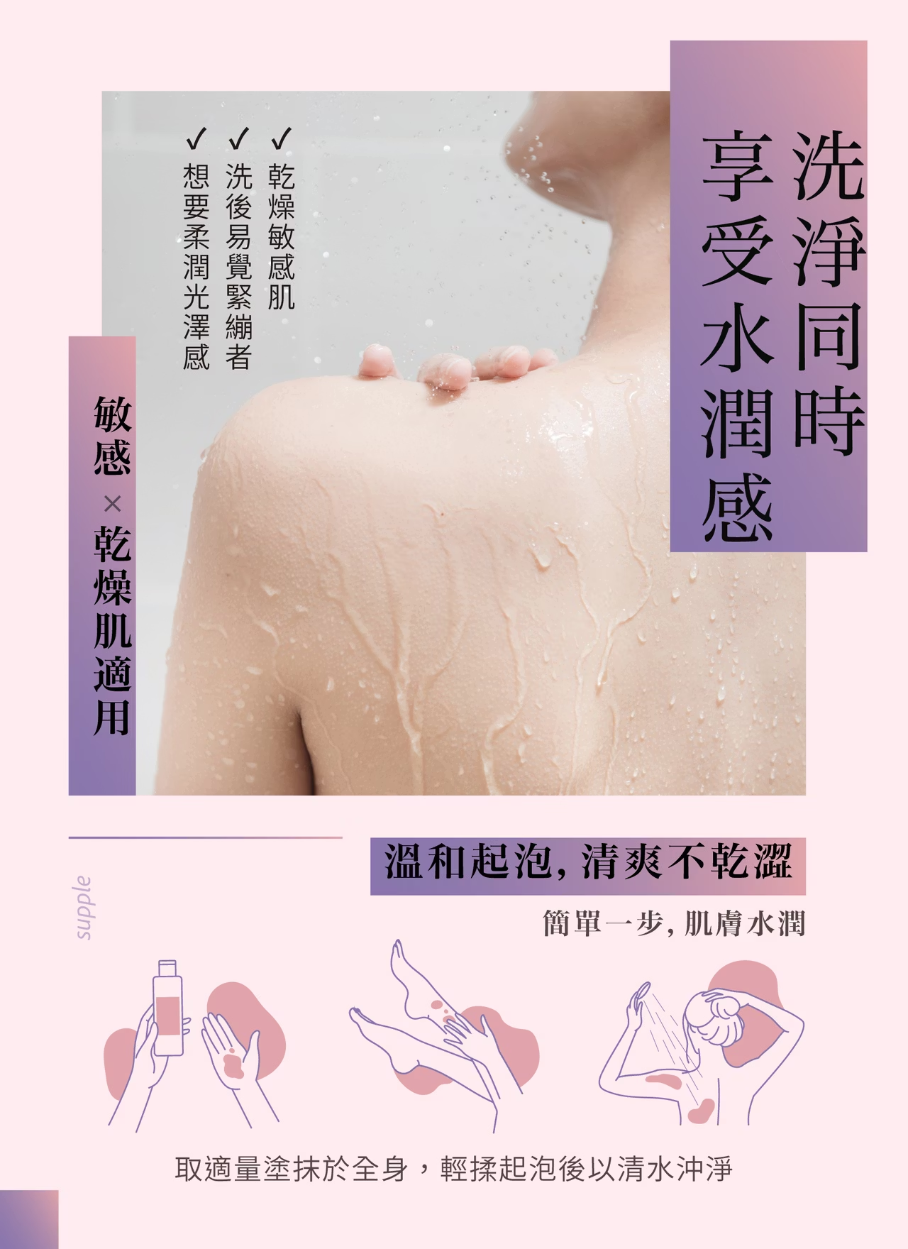 取適量身體乳於手掌,加水搓揉,起泡後塗抹身體肌膚後用清水清潔。
