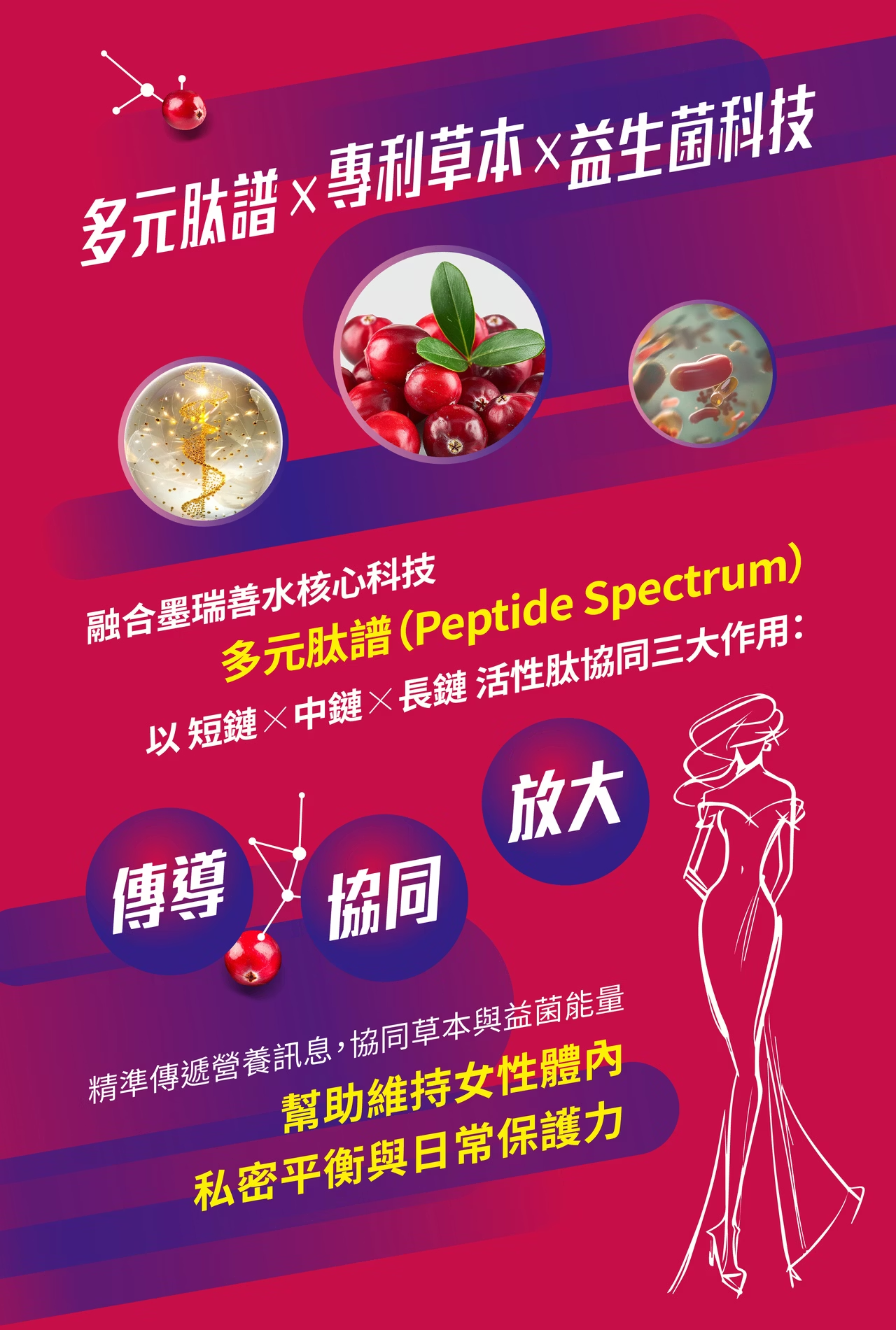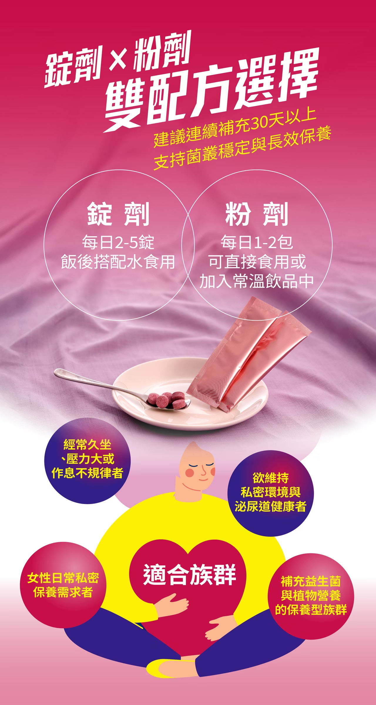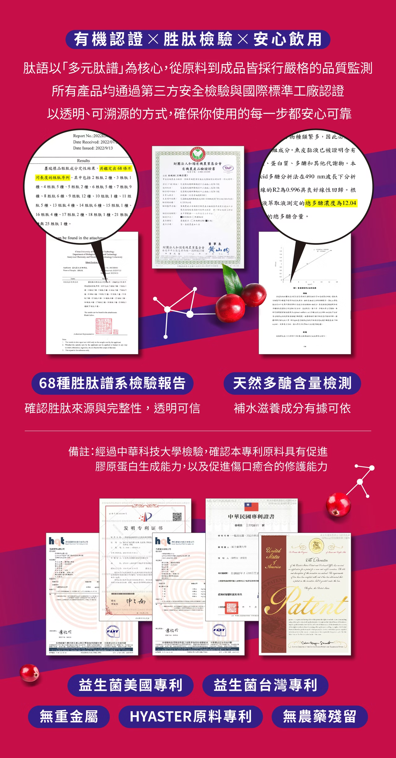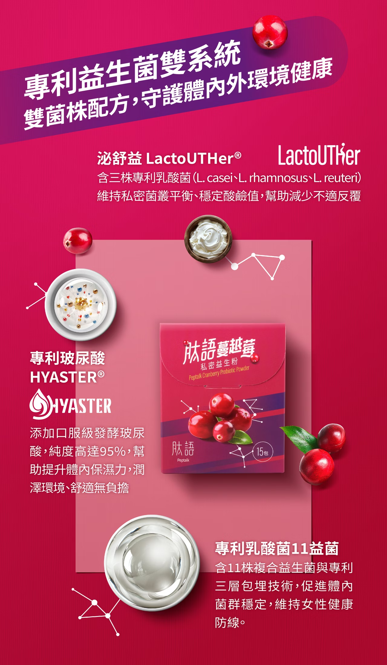 rhamnosus凍乾物、麥芽糊精)、羅伊氏乳桿菌 (Lactobacillus reuteri凍乾物)))、蔓越莓萃取物、蔓越莓香料粉(麥芽糊精、 蔓越莓香料(丙二醇、乙醇、香料)、阿拉伯膠)、蔓越莓調味果汁粉(砂糖、蔓越莓果汁粉(麥芽糊精、蔓越莓濃縮汁、葡萄汁色素、辛烯基丁二酸鈉澱粉、黑加侖濃縮汁)、辛烯基丁二酸鈉澱粉、檸檬酸、檸檬酸鈉、玉米澱粉、洛神花萃取粉(麥芽糊精、洛神花)、蘋果酸、蔓越莓香料粉(辛烯基丁二酸鈉澱粉、麥芽糊精、蔓越莓香料、脂肪酸甘油酯、維生素E(抗氧化劑))、β-胡蘿蔔素(麥芽糊精、阿拉伯膠、中鏈三酸甘油酯、蔗糖、L-抗壞血酸鈉(抗氧化劑)、β-胡蘿蔔素、 二氧化矽、生育醇(維生素E)(抗氧化劑)))、甘露糖、蔓越莓萃取(蔓越莓萃取物、麥芽糊精)、複合乳酸菌(微結晶狀a-纖維素、專利乳酸菌凍乾粉 (麥芽糊精、乾酪乳桿菌L.case、植物乳桿菌L.plantarum、鼠李糖乳桿菌 L.rhamnosus、短雙歧桿菌B.breve、乳雙歧桿菌B.lactis、長雙歧桿菌 B.longum、副乾酪乳桿菌L.paracasei、嗜熱鏈球S.thermophilus、嗜酸乳桿菌L.acidophilus、羅伊氏乳桿菌L.reuteri、兩歧雙歧桿菌B.bifidum))、 流行鏈球菌發酵物(含透明質酸鈉)、綜合莓果萃取(巴西莓、蔓越莓、覆盆莓、
