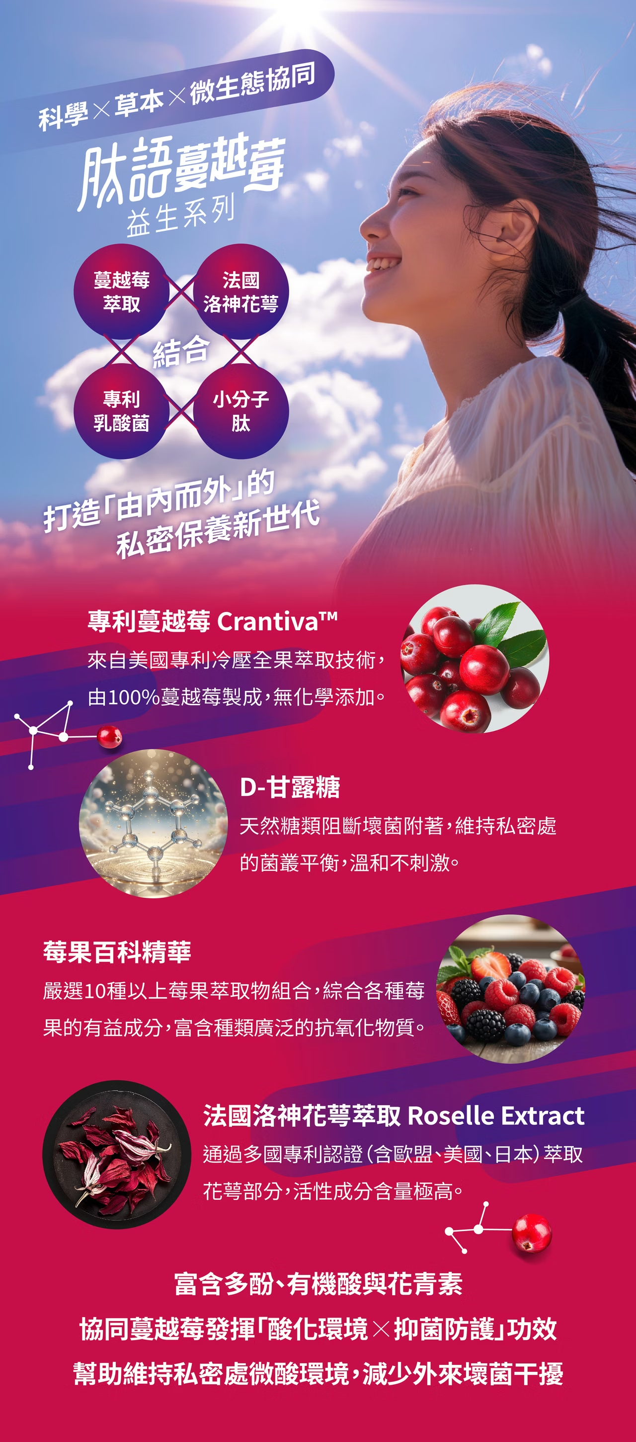 玉米澱粉、洛神花萃取粉(麥芽糊精、洛神花)、蘋果酸、蔓越莓香料粉(辛烯基丁二酸鈉澱粉、麥芽糊精、蔓越莓香料、脂肪酸甘油酯、維生素E(抗氧化劑))、β-胡蘿蔔素(麥芽糊精、阿拉伯膠、中鏈三酸甘油酯、蔗糖、L-抗壞血酸鈉(抗氧化劑)、β-胡蘿蔔素、二氧化矽、生育醇(維生素E)(抗氧化劑)))、膠原蛋白(鱈魚膠原蛋白肽、賦形劑(麥芽糊精)、水)、甘露糖、流行鏈球菌發酵物(含透明質酸鈉)、蔓越莓香料粉(麥芽糊精、蔓越莓香料(丙二醇、乙醇、香料)、 阿拉伯膠)、蔓越莓萃取(蔓越莓萃取物、麥芽糊精)、 複合乳酸菌(微結晶狀a-纖維素、專利乳酸菌凍乾粉(麥芽糊精、乾酪乳桿菌L.case、植物乳桿菌 L.plantarum、鼠李糖乳桿菌L.rhamnosus、短雙歧桿菌B.breve、乳雙歧桿菌B.lactis、長雙歧桿菌 B.longum、副乾酪乳桿菌L.paracase、嗜熱鏈球 S.thermophilus、嗜酸乳桿菌L.acidophilus、