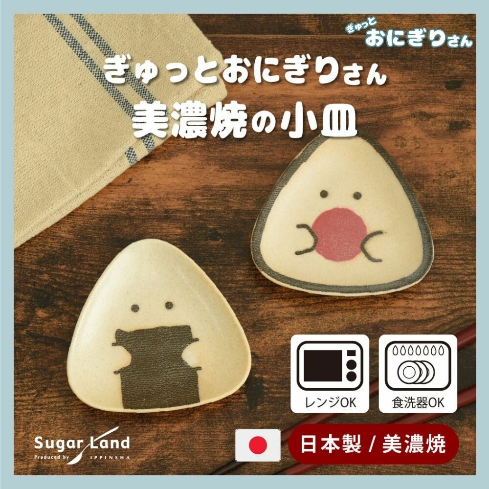 以美濃燒工藝製作的三角小碟,將「抱緊飯糰君」的可愛圖樣與細緻砂感釉面結合。
