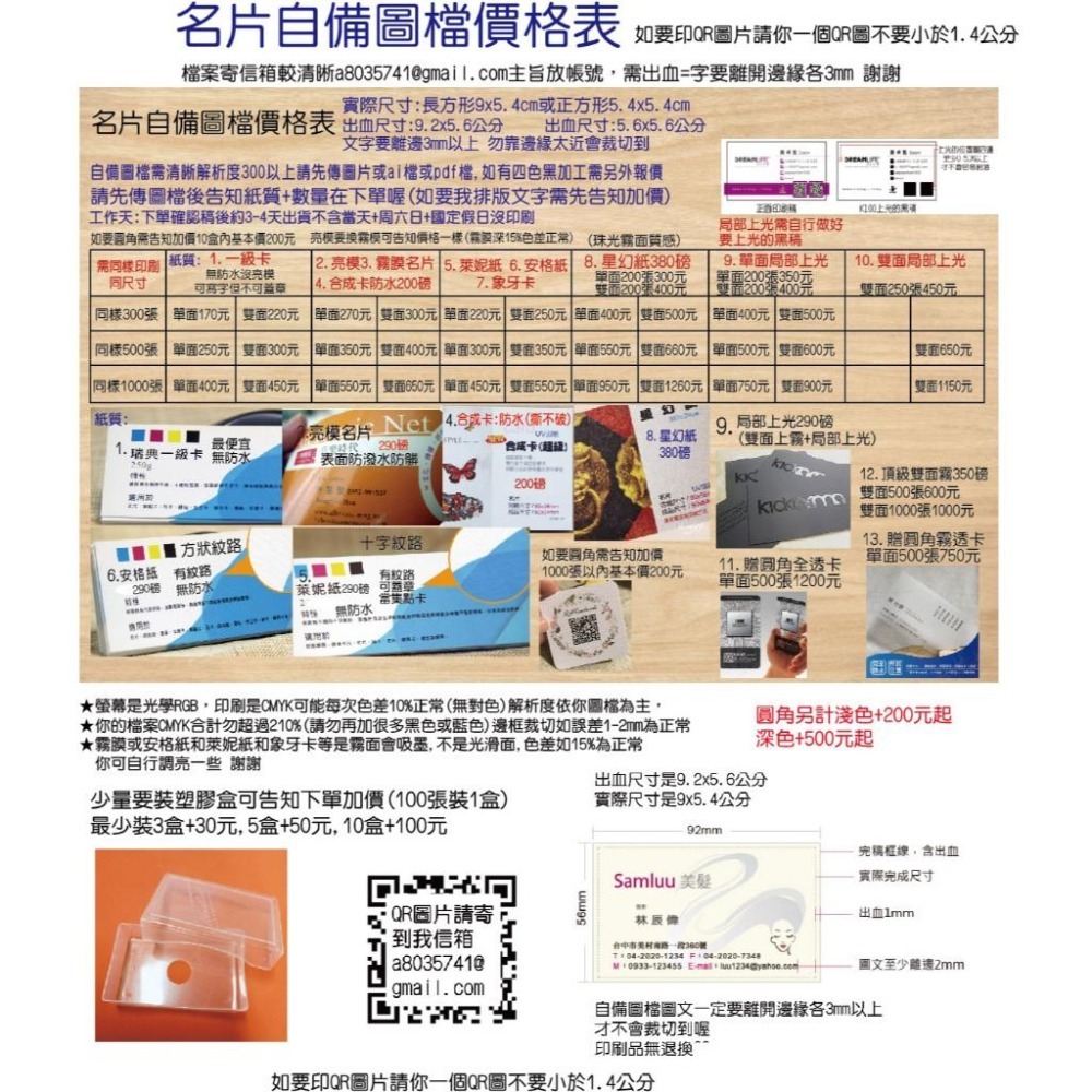 (另有貼紙或客製字賣聊聊詢問)請你先傳圖稿,如沒有檔案請先聊聊告知要排版的文字內容和款式底圖 如要印QR圖片,請寄到信箱較清晰a8035741@gmail.com主旨放你的蝦皮帳號,或是搜尋客服手機0985345773 如要加大尺寸可以聊聊告知長x寬+數量後報價? 量多會優惠報價~確認後下單輸入金額, 此價無含裝塑膠盒 ★名片尺寸9x5.4公分或方形5.4x5.4公分(如你要放QR部分不要小於0.9公分確認能掃出) 🔰另有客製賣場(如要看其他底圖可告知你的文字內容會再傳相關圖庫網址) 如需要收據<不是發票>需下單備註唷 🔰下單後會印刷不能取消 📌超商確認你能取貨?(沒空或要去外地不要用超商)務必注意簡訊通知早日取貨,不要拖到後1~2天造成困擾※如不取貨給負評+提告+黑名單公佈😡不取貨算詐欺罪 📌辛苦排版和印刷勿要求太高★假如需改進請私下聊聊就好,不要給負評造成彼此傷害,拜託配合才會接單~謝謝喔希望是好買家 🔰有檢查好才出貨,請拆貨前要完整錄影,無錄影無法受理問題(訂單完成無處理) 🙏如要收據下單需備註留言才會一起寄 🔰依消費者要求所為之客製化「此商品屬 「例外商品類別*」,不適用7天鑑賞期法規。」(無退換)謝謝訂購好評價熱賣中~可回購喔
