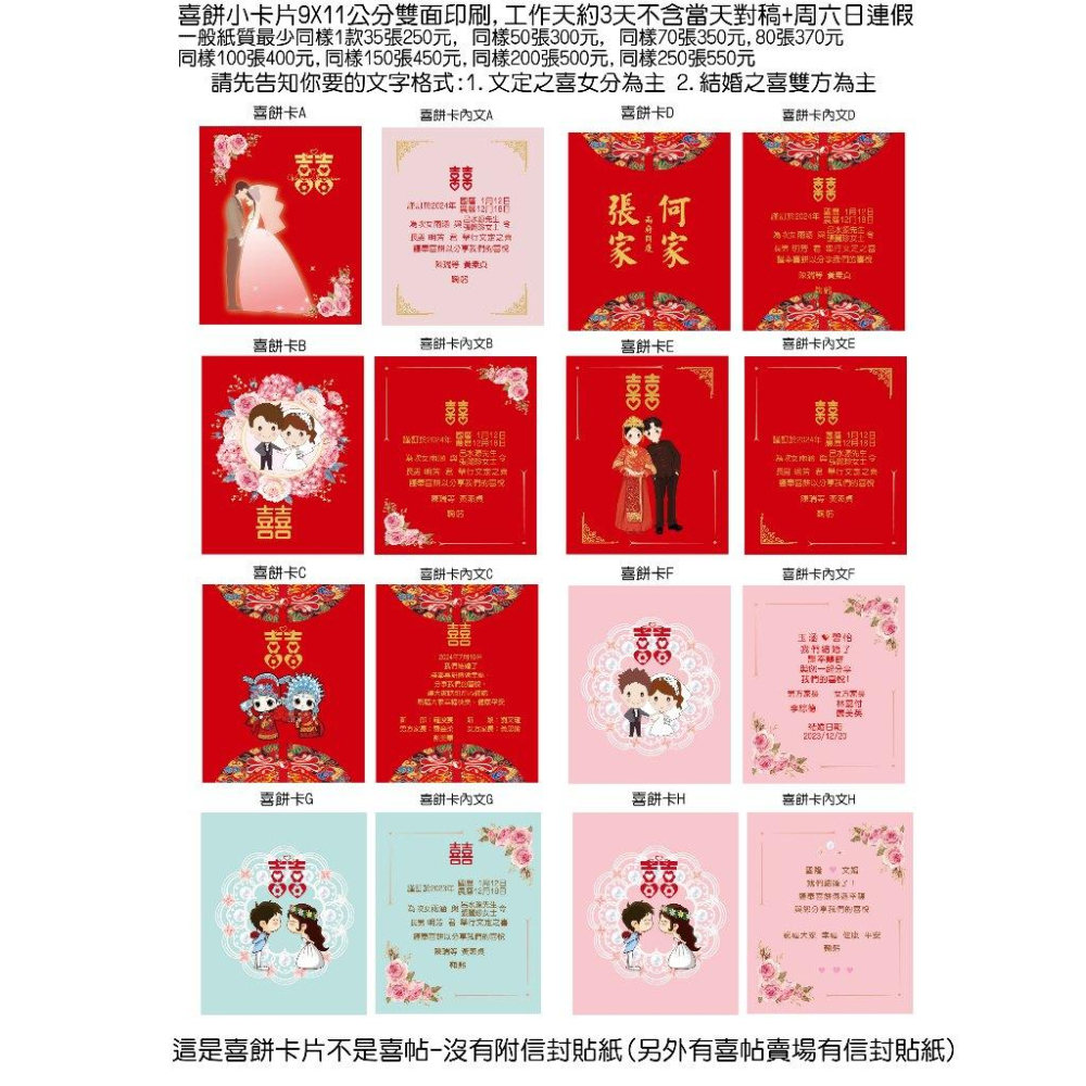 你好 下單選項已經有價格和數量,圖上也有價格的,這是平面卡的報價(沒有上膜)9x11公分方形喜餅小卡片(不是吊卡不是喜帖-無附信封貼紙)★請傳圖或截圖我款式留言編號(最下方說明有資料表可複製後填寫給我或是聊聊索取資料表) 可選一款正面和任選一款內文(文字都可以客製修改)請務必留言數量?下單選項有價格下單才會排版對稿(圖上有價格如急請事先告知才會優先)請先告知你要的文字格式:1.文定之喜女分為主 2.結婚之喜雙方為主 你好 下單選項已經有尺寸+數量價格: (如要改字務必聊聊告知)請你先下單備註款式名稱,我才會接單辛苦排版給你看(勿取消)(對稿只有早上10點到晚上9點為止) ★如急勿用蝦皮到店★請下單其他物流或宅配/郵寄假日休息 ★客製文字內容都可聊聊告知1.文定之喜女方為主 2.結婚之喜雙方合請(請提供正確文字內容)下單後才會對稿~請你聊聊下單通知,謝謝喔 https://s-cf-tw.shopeesz.com/file/tw-11134208-7ra0q-mcx8fuom1oowaf https://s-cf-tw.shopeesz.com/file/tw-11134208-81ztg-mezql8vsqfbj83 ★可客製內文,圖片照片你都可以提供更換,請寄信箱後通知我a8035741@gmail.com 照片勿傳聊聊會壓縮(依照照片紙質印刷 不是相館) https://s-cf-tw.shopeesz.com/file/tw-11134208-7ra0i-mcxgmy3rkc3j49 請你選圖上一款封面和內文(可任意搭配)我可排版內文(最下面有資料表你可複製填寫或是聊聊向我索取資料表) ★卡片需工作約3~4天後出貨不含當天+週六日假日只接單📌★如急勿用蝦皮超商★急需先告知可郵寄/宅配★超商到貨日物流為主★文字可以修改(如要放你的圖片需先傳來看在報價)印刷內容需相同,如不一樣請分開告知數量 方形純卡片印刷無信封和貼紙(如要改成吊卡方形需打洞加工費用+200元) ★最下面有資料表或聊聊索取填寫資料通知要對稿,🚩如要對稿請務必通知我等你確認? (勿過久不回應~因為蝦皮有出貨期限~如一直沒有回應會照資料印刷)★需工作天不含假日請提早訂購 我有另售客製婚禮喜帖或貼紙和謝卡可留言告知 🚩卡片需工作天:下單確認稿後約3天寄出不含當天+週六日★到貨日物流為主-有超商或郵寄📌急需告知可宅配才能指定到貨日 🔰如自備圖檔勿太細線小字可傳jpg圖片或ai檔或PDF檔需先寄信箱通知~尺寸需正確a8035741@gmail.com 請寄到信箱較清晰通知收信,主旨放蝦皮帳號,重要文字要離開邊緣各3mm以免裁到,解析度依你的為主 🔰超商取貨留手機?確認你能取貨 不可有未取記錄(沒空或要去外地不要用超商)請注意簡訊通知早日取貨,不要拖到最後1天造成困擾※(勿不取貨會報警提告😡負評公開帳號) 🔰螢幕顏色為RGB和印刷為CMYK可能約10~15%色差正常(如你自備圖檔可自行調亮)依照確認稿文字印刷,對折裁切可能約1-2mm誤差正常勿要求過高 📌辛苦排版和印刷勿要求太高★假如需改進請私下聊聊就好,不要給負評造成彼此傷害,拜託配合才會接單~謝謝喔希望是好買家 🔰依消費者要求所為之客製化「此商品屬 「例外商品類別*」,不適用7天鑑賞期法規。」(無退換)謝謝訂購好評價熱賣中 🔰有檢查好才出貨,請拆貨前要完整錄影,馬上檢查(訂單完成無處理~謝謝訂購) ---------------------------------------------------------------------------------------------- 這賣場是小張喜餅卡請提供資料下單幾組後才會傳圖稿校稿喔,早日訂購(免費3次內修改,確認後無改) 訂購人: 手機: 1個款式編號? 方式:1.文定之囍 2.文定暨結婚之囍(女方為主還是雙方?) 3.結婚之囍 (女方或雙方為主?) 請填寫資料:中華民國 年(日期如不放可不寫) 國曆 月 日 農曆 月 日 新郎姓名: 排行:例如長男 (男女排行分開算) 父親姓名: 母親姓名: 新娘姓名: 排行:例如長女 不在的不用寫(如去世有要放上請告知要畫框) 祖父姓名: 祖母姓名: 父親姓名: 母親姓名: ================================================================================= 另售喜帖印刷請看我的賣場有更多款式圖(如你自備檔案請先傳來看看) 🔰另售少量喜帖/婚禮小物貼/喜餅貼紙/謝卡喜餅提領卡/婚禮留言卡請看賣場或聊聊 https://s-cf-tw.shopeesz.com/file/tw-11134208-7ra0g-mb9655nurvme22 https://s-cf-tw.shopeesz.com/file/tw-11134208-7r98t-ltqvj058z5nz29 https://s-cf-tw.shopeesz.com/file/tw-11134208-7rasc-m59krzpvsv929c https://s-cf-tw.shopeesz.com/file/tw-11134208-7rasb-m59krzpvu9ti3d https://s-cf-tw.shopeesz.com/file/tw-11134208-7ras8-m59krzpvvody5c https://s-cf-tw.shopeesz.com/file/tw-11134208-7rase-m59krzpvx2ye28 https://s-cf-tw.shopeesz.com/file/tw-11134208-7rasj-m59krzpvyhiu53 https://s-cf-tw.shopeesz.com/file/tw-11134208-7ra0j-mb9655nuta6u91 可加購