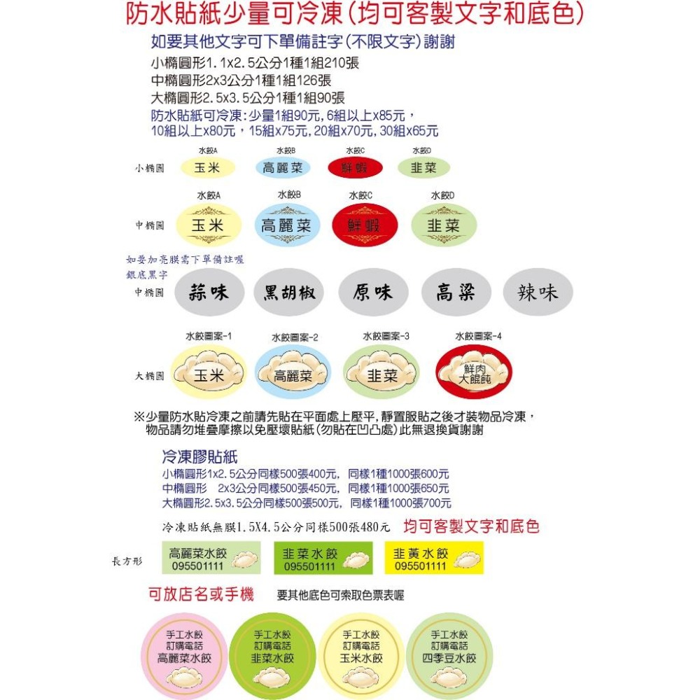 多組優惠客製文字水餃貼紙防水冷凍貼紙口味飲料姓名貼 店名電話 水餃高麗菜玉米韭菜 原味 辣味 高粱蒜味香腸貼紙米琪印刷