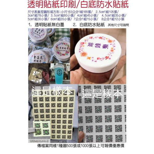 你好★彩色印刷品質好~紙質有區分:1.彩色透明貼紙無白色(只能貼在白底物品上才清楚)或可印透明貼黑字 2.如透明貼要在有顏色深色物品上需事先告知另外報價量多喔 3.白底亮膜貼紙(以上紙質均可完全防水防曬不掉色) 圖上和下單選項已經尺寸表有寫一組幾張,請自己下單選尺寸,輸入要幾組?聊聊告知或備註要印的文字內容?留言貼紙尺寸,不是告知瓶子尺寸,和數量,紙質等文字資料?下單後通知我才會排版給你看,謝謝理解(請自行下單) 圖上或下單選項有價格表請你先下單提供文字資料等,我才會接單排版,請勿不下單造成困擾,留言告知尺寸紙和質(最後選項有多組優惠)※注意事項:如需要客製文字請先下單留言文字資料(訂購人手機)和尺寸和幾組?1.如需要對稿請下單備註或聊聊告知(2.如無備註告知會照資料文字直接印刷無退換)謝謝理解 蝦皮這有出貨期限無法久等※※ 此賣場包含排版可客製文字或代印QR圖電話LOGO圖等等(不是燙金另計)也可傳圖代印大量可優惠報價 下面圖有放少量的尺寸1組幾張貼和價格表(如多款最少可各一組以上)請留言尺寸和需幾組? 少量可急件~多組優惠 ★以下為1.彩色透明貼紙無白色(只能貼在白底物品上才清楚)或可印透明貼黑字 2.如透明貼要在有顏色深色物品上需事先告知另外報價量多喔 此包含客製印刷品質好~請先聊聊或截圖款式+尺寸+文字內容?幾組或是數量? 少量或大量都可告知~你確認報價要訂購後我才會排版給你看圖稿~謝謝 如不急量多同樣500張或同樣1000張以上可告知不急數量+紙質聊聊報價 *你好,如客製需要提供印刷資料或截圖款式給我: 1.貼紙的尺寸? 2.需幾組或是數量? 3.紙質要哪一種?1.防水貼紙無膜 2.銅版亮膜貼紙(一般防潑水) 4.哪一個款式圖,是否要改字?是否不急? 我才能回覆報價,謝謝 https://s-cf-tw.shopeesz.com/file/tw-11134208-81zti-mhq64oas3hmtf3 ★以下為彩色防水貼紙價格表(不是透明貼) https://s-cf-tw.shopeesz.com/file/tw-11134208-81zto-mhlj0zir1vd0df ★聊聊無法傳QR圖蝦皮會阻擋~要印刷的文字內容如有QR圖請先寄信箱a8035741@gmail.com才下單或是搜尋手機0985345773 https://s-cf-tw.shopeesz.com/file/tw-11134208-7ra0q-mcjfpxz7yz8sae https://s-cf-tw.shopeesz.com/file/tw-11134208-81ztc-mhedc2tdxxce6d https://s-cf-tw.shopeesz.com/file/tw-11134208-7r98y-lmh28i4h6hzv3a 如不急量多500張或1000張以上可告知不急數量+紙質聊聊報價 https://s-cf-tw.shopeesz.com/file/tw-11134208-7rbkb-m88ieadsck1x5b https://s-cf-tw.shopeesz.com/file/tw-11134208-81ztm-mhedc2tdtpn28b https://s-cf-tw.shopeesz.com/file/tw-11134208-81zto-mhedc2tdv47i63 https://s-cf-tw.shopeesz.com/file/tw-11134208-81ztk-mhedc2tdwiry79 如要看其他款花邊圖庫可聊聊告知 ★多組優惠~我可客製文字聊聊或你自備圖檔或要放QR圖或LOGO圖請寄到信箱:a8035741@gmail.com 通知收信,主旨放蝦皮帳號 (因蝦皮會阻擋QR圖) ★如滿千量多優惠 ★下單後平日或假日都可以先對稿🚩如超急需先告知會出貨白底防水貼無亮膜~可簡單排版文字(可聊聊報價) 😀下單備註留言取件人手機,如要對稿請務必聊聊告知?記得回覆我?勿不回應~謝謝 📌工作天:下單確認稿後少量約3天出貨不含假日(假日只有對稿)如量多無急約4天後不含假日~如急件麻煩下單宅配或郵寄不要一直問卻不下單謝謝📌如急勿用蝦皮無急到貨日物流為主 🚩下單有單價,點幾組,再點紙質,下單輸入+幾組?越多組單價越便宜,例如想要4組,下單選:同樣4組以上單價,數量要輸入+4 同樣印刷可直接下單輸入要幾組? (客製字2組起) 🙏如你自備檔案~請先傳送圖檔聊聊告知紙質+尺寸+數量?才能優惠報價喔(大尺寸可報價更優惠) 🚩如急勿用蝦皮轉運久無急★急需先告知可郵寄/宅配★到貨日物流為主 透明貼少量會透光(只能貼在白底淺色物品上喔)🚩請先下訂單通知★我才會跟你對稿修改(勿棄單)謝謝配合★下面有尺寸價格表 🚩客製排版請先聊聊留言:紙質(有分透明貼或白底貼)和尺寸+款式圖+文字內容和字體? 注意下單後通知才會排版(如不急要對稿需聊聊通知我等你確認? (勿過久不回應~因為蝦皮有出貨期限)聊聊留言我有空會回★如你自備LOGO圖或QR圖請寄到信箱:a8035741@gmail.com 通知收信,主旨放蝦皮帳號 (如不會算麻煩聊聊告知你需要的紙質+數量+是否急件?到貨日要看物流~量多無急才會優惠~讓我報價喔謝謝)此含第一次排版之後回購多組可報價更優惠~客製10組以上贈1組 如你有自備完整圖檔也可報價,少量幾組 或量多例如500張1000張2000張以上 「半斷」,成品就是一大張紙裡有多張小張貼紙(像姓名貼那樣) 🔰工作天:下單確認稿後少量約2~3天後出貨不含當天+假日★量多約4天後不含當天+假日只接單(均平日印刷)🚩到貨日物流為主★急勿用蝦皮運送慢📌很急需事先告知可宅配才能指定到貨日 紙質有區分:1.透明貼無白墨(只能貼在白淺色物品上勿深色) 2.要貼深色物品上需透明貼+印白色墨最少500張以上告知尺寸報價 3.白底防水貼紙(注意如要貼瓶身圓弧處請選擇無亮膜材質)★下面有尺寸價格表圖或如要量多可告知數量報價 量多無急自備檔案可優惠報價 🚩注意如你有自備檔案可傳jpg圖片或ai檔或pdf檔:尺寸需正確請寄到信箱:a8035741@gmail.com 通知收信,主旨放蝦皮帳號 1.注意需出血=重要文字要離開邊緣各3mm以免裁到,解析度依你的為主 2.螢幕是光學RGB,但印刷是CMYK不一樣,如有色差10-15%為正常★霧面可能20%(無對色,請自行調亮)CMYK合計勿超過2