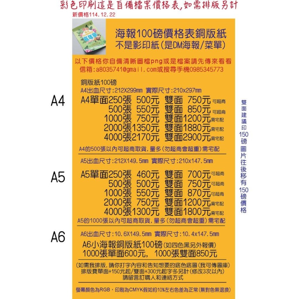 你好 ★圖上有價格可自備圖檔案★螢幕顏色均為參考~印刷無對色謝謝理解~有100磅 影片為150磅雙面銅版紙海報,賣場商品圖上有放價格表(用超商勿超重5公斤)1000張以上選宅配 大量可報價 客服0985345773 可傳送清晰自備圖檔png或是pdf檔案需出血請先傳來看看(文字不要靠近邊緣) 四色彩色印刷~好品質~螢幕顏色均為參考~印刷無對色 謝謝 ★可7-11全家★如超商勿超重5公斤=500張,另有宅配或郵寄✍️自備檔案可寄到信箱: a8035741@gmail.com 主旨放蝦皮帳號或手機0985345773 🚩勿傳聊聊會壓縮★如你不肯寄信箱(★照片是依照你給的解析度印刷 請你自行打亮不要傳太暗色無退換 謝謝理解,因為我很忙碌沒辦法一一解釋)圖稿只是示意圖,印刷顏色主要依照紙質和機台為主 謝謝 ★圖上有價格可自備圖檔 (排版另計)其他底圖圖庫網址可聊聊留言產品文字,不急只有簡單排版文字和底色客製尺寸,其他QR圖案電話LOGO圖請你自行提供我沒有在設計(不是燙金另計)※注意事項:★提供文字資料後,對稿改字1-3次以內(請勿多次修改尤其在晚上謝謝理解)*請你當天先下單後我才會排版對稿,這有出貨期限,請你當天給資料確認圖稿不要拖,謝謝理解 (如要收據請事先告知)請你自備檔案需出血因為圖邊緣會裁掉,文字要離邊3mm以上以免裁切到(更大海報有分室內或室外請先告知才能報價) 需出血 解析度依你的為主需350以上勿傳模糊勿小字不清晰 紙質有銅版紙★如蝦皮超商無急出★請下單其他物流或宅配(郵寄假日休息)5公斤以內可超商純取貨 超過需宅配喔勿超重 https://s-cf-tw.shopeesz.com/file/tw-11134208-81ztj-mjgm1kz2qfpdb7 https://s-cf-tw.shopeesz.com/file/tw-11134208-81ztk-mjgm1kyyd43k34 https://s-cf-tw.shopeesz.com/file/tw-11134208-81ztp-mdwmhbvdpblxad https://s-cf-tw.shopeesz.com/file/tw-11134208-81zto-mi32dybq34lj78 https://s-cf-tw.shopeesz.com/file/tw-11134208-7rbk1-mac4qg24rqdy2c https://s-cf-tw.shopeesz.com/file/tw-11134208-81zto-mhoqdcnmdaf6c8 菜單排版樣本,排版費另計如需要其他底圖圖庫網址可聊聊留言產品文字內容 https://s-cf-tw.shopeesz.com/file/tw-11134208-7r98y-lx9xmfhysilib7 📌海報印刷工作天下單後銅版紙約3~4天後出貨,聯單約7天出貨不含當天和周六日國定假日🚩到貨日物流為主可郵寄或宅配★如急勿用ok蝦皮超商物流運送慢無急 📌超商取貨需告知,確認你能取貨?(要出差,出國不要用超商)務必注意簡訊通知早日取貨,不要拖到後1~2天造成困擾※棄單損失會提告+黑名單公開帳號資料😡不取貨算詐欺罪 ★螢幕顏色為RGB和印刷為CMYK約10-15%色差正常(無對色)勿要求過高,邊線框裁切可能1-2mm誤差正常無退換 🔰依消費者要求所為之客製化「此商品屬 「例外商品類別*」,不適用7天鑑賞期法規。」(無退換) 另售圓形橢圓形或名片貼紙,吊牌,地址貼紙等請看我的賣場 🔰有檢查好才出貨,請拆貨前要完整錄影,無錄影無法受理問題(訂單完成無處理) https://s-cf-tw.shopeesz.com/file/tw-11134208-81ztc-mel2rqyy21vnb5 https://s-cf-tw.shopeesz.com/file/tw-11134208-7ra0i-mcbk0oehkun0a6