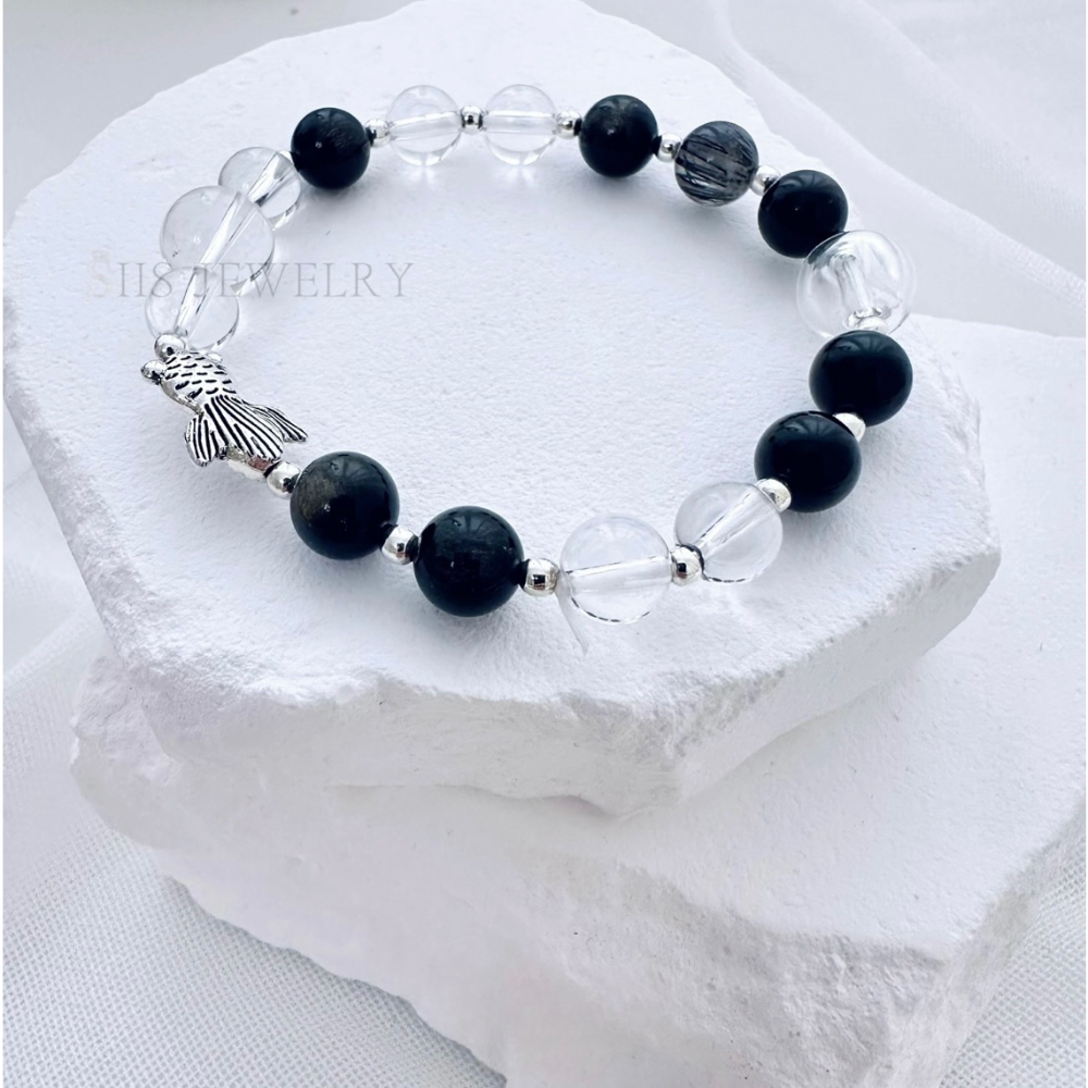 黑曜石穩定氣場,像是幫你築起防線,保護你的心不再被外界輕易影響,白水晶提升判斷力,讓你在是非之間更清楚看見自己的立場與選擇,銀色小魚吊飾,是象徵靈動與守護的意象。
