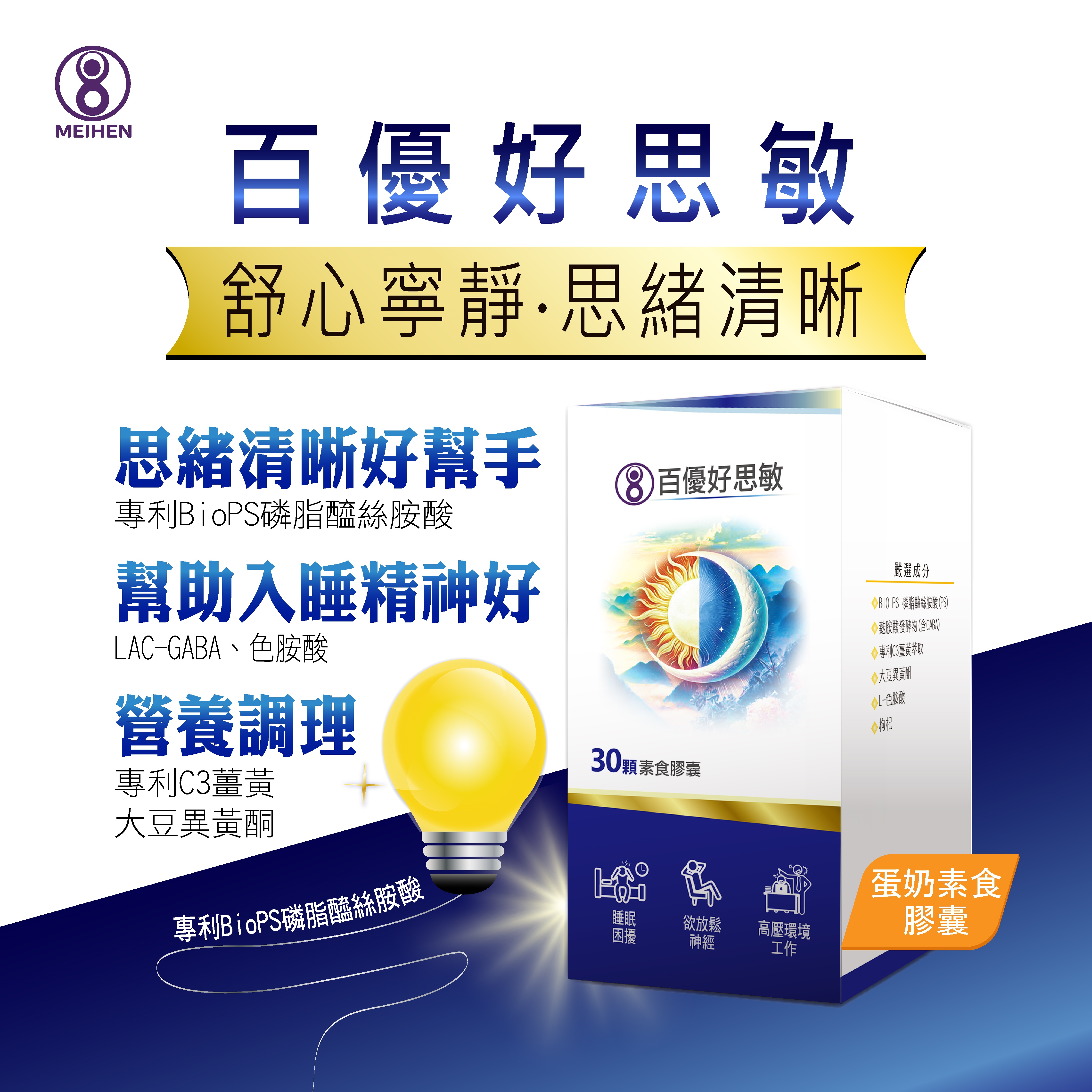 MEIHEN美恆 百優好思敏 素食膠囊 幫助入睡 思緒清晰 L-色胺酸 GABA 大豆異黃酮 C3薑黃 美恆無限生醫