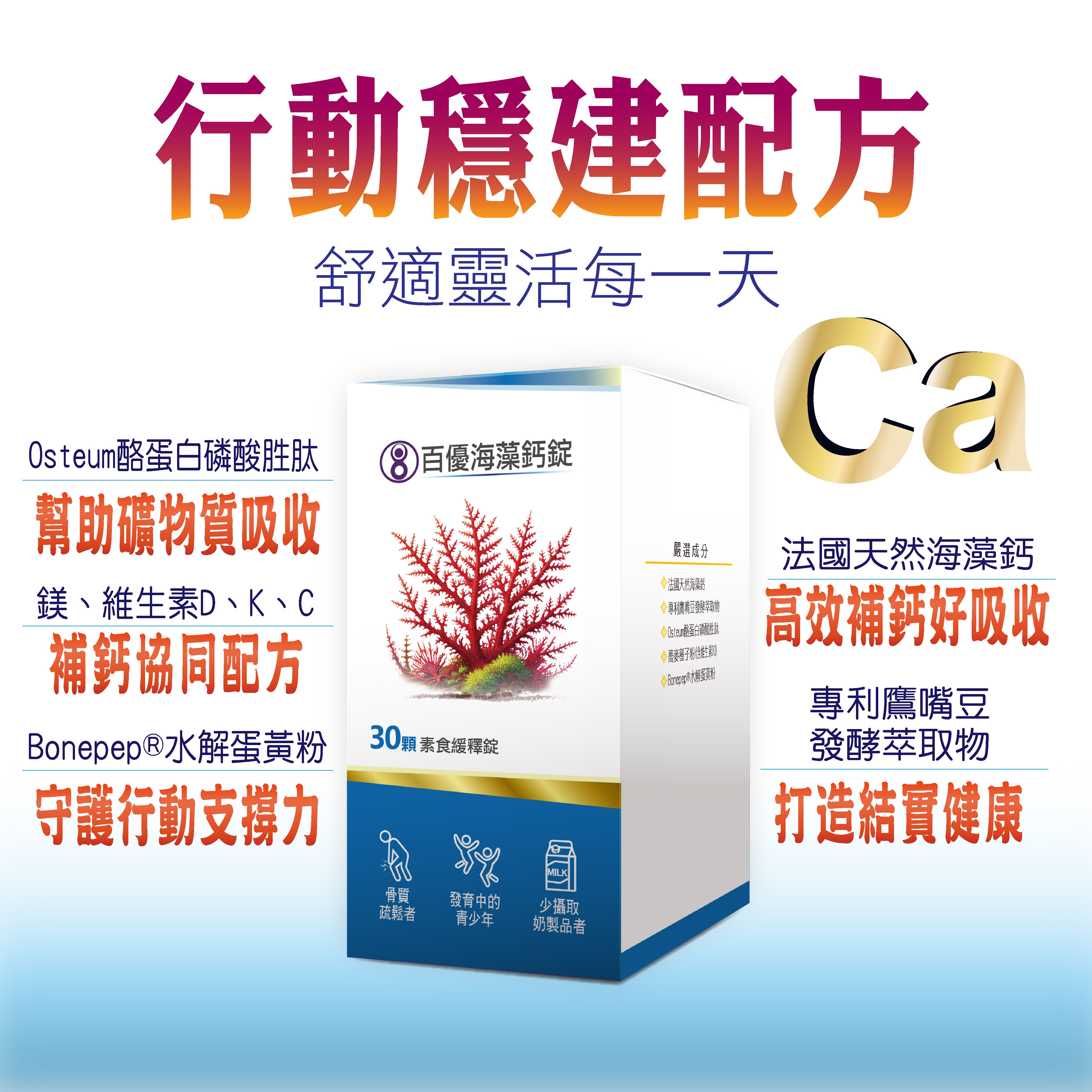 百優海藻鈣選用「法國天然紅藻鈣」,具蜂巢微孔結構,易吸收消化。天然鹼性,富含鈣與多種礦物質,幫助調整體質,維持行動力健康。
