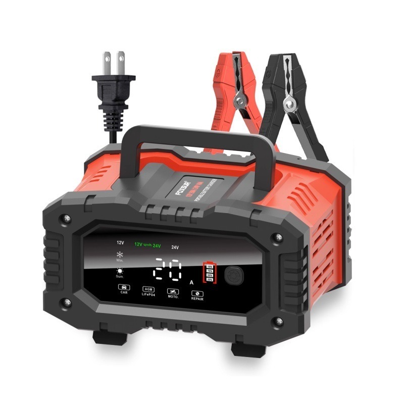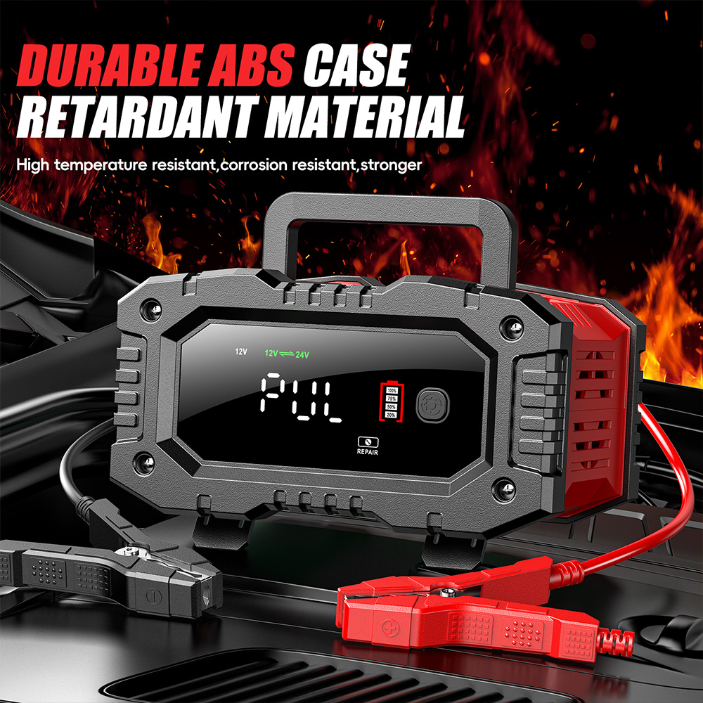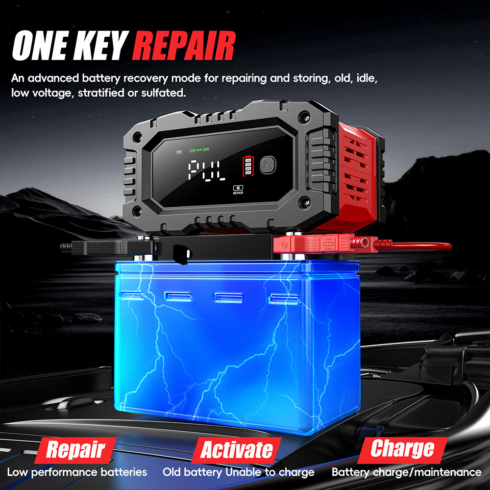 汽車電池充電器 12 / 24 V,輸入電源: 100-240V全球寬電壓。 採用高功率高頻低頻脈衝技術,可以更好地消除電池的硫化現象,有助於恢復舊/閒置電池的損失性能,並延長使用壽命。