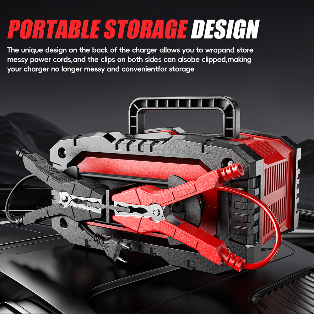 便攜式汽車電池充電器夾在充電器兩側,可以夾在產品背面,並且可以存放凌亂的電源線,使您的充電線更加整齊。 同時,我們設計了一個便攜式手柄,電池充電器僅重 約 0.8 公斤,方便您移動。