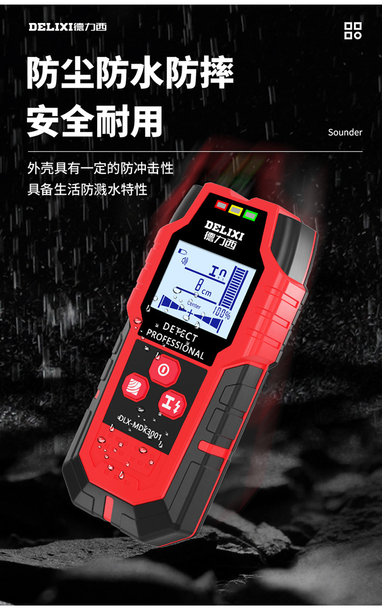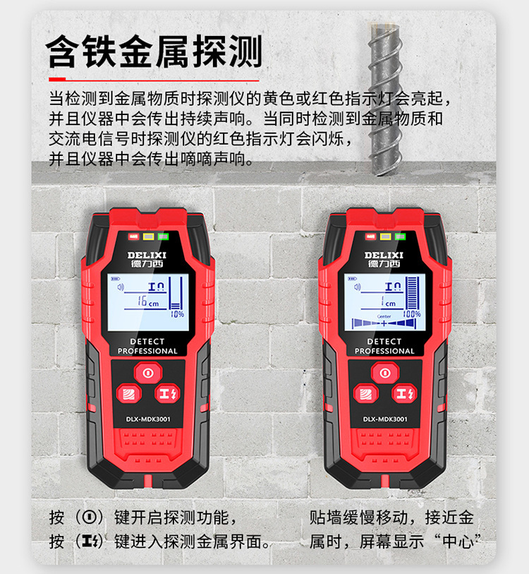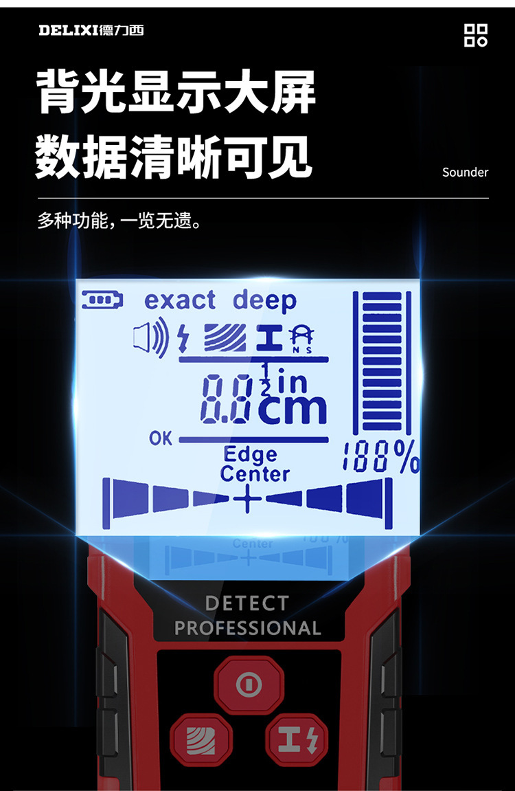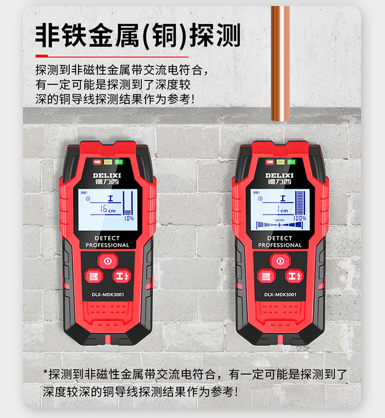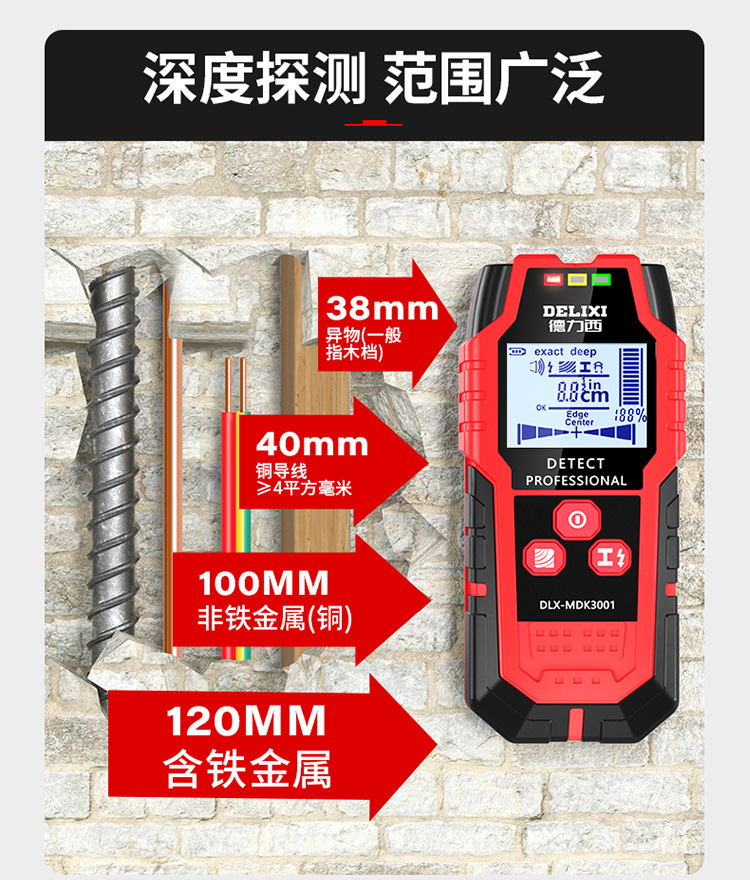牆體探測深度:木材<38mm、帶電電纜<40mm、非磁性金屬(銅)<100mm、磁性金屬<120mm