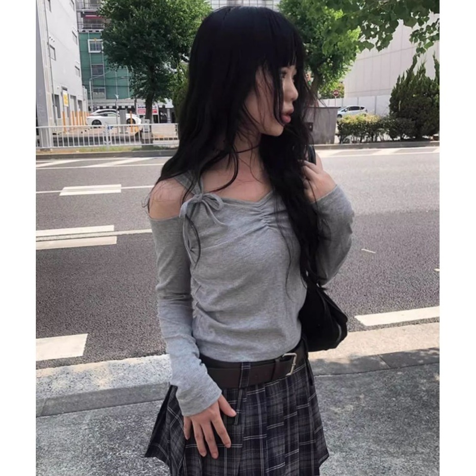 * 微露肩設計自然修飾肩頸線條,展現低調的韓系性感氛圍