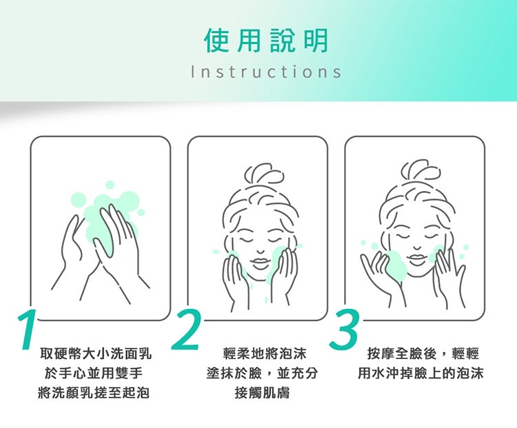 2️⃣ 取適量洗面乳起泡,輕柔按摩臉部30秒
