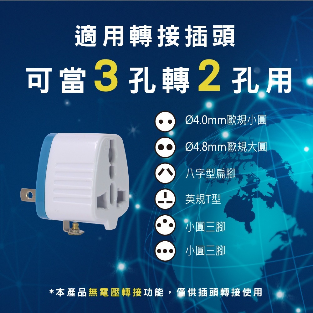 此產品只用於各國插頭之轉換,電壓無法轉換,使用前請先注意電器的使用電壓,以免損壞電器或電子用品本身!
