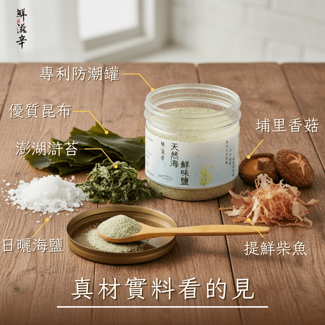 成分:澳洲天然海鹽、昆布、澎湖滸苔、埔里香菇、柴魚、洋蔥