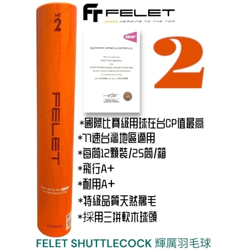台灣公司貨【FELET NO.2】羽毛球 Orange 輝厲2號 BWF認證 羽球 黃色 國際 比賽級 正版