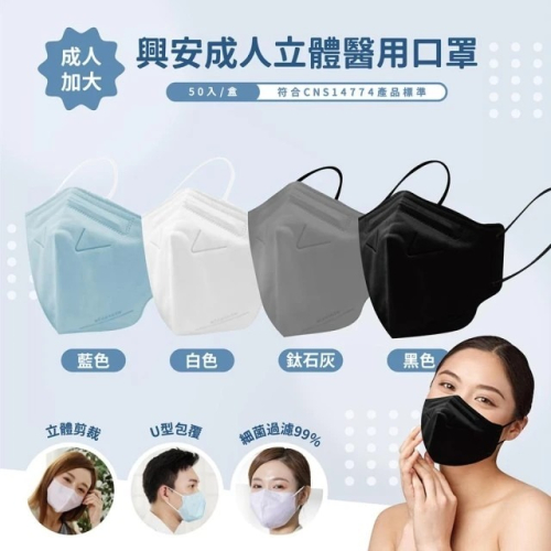 【興安】加大款 成人3D立體醫用口罩 (50入/盒) 📍商品詳情 ● 商品名稱:興安醫用口罩(未滅菌) ● 商品產地:台灣(MADE IN TAIWAN) ● 主要成分:非織物不織布、MB不織布,EP不織布, 彈性細繩 ● 商品尺寸:成人適用 16x12cm (±0.3) ● 販售規格:50入/盒 ● 保存期限 : 五年 ● 製造日期:製造日期因庫存批次會有所不同,請詳見產品包裝標示。 📍製造商資訊 ● 製造商名稱:興安衛材股份有限公司汐萬廠 ● 製造商電話:(02)2646-6666 ● 製造商地址:新北市汐止區汐萬路二段122巷14號2樓 ● 製造業藥商名稱:興安衛材股份有限公司 ● 新北府汐衛藥販字第6231118411號 ● 新北府汐衛藥製字第6131112211號 ● 衛部醫器製壹字第009096號 ● 工廠登記證號65008879 ----💊---- 藥商許可證所載藥商名稱:富達開發投資有限公司 藥商許可證所載藥商地址:新北市三重區永福街204號五樓 醫器販字:新北府重衛醫器販字第MD6231009908號 ☎️ 藥商諮詢電話:02-8521-8338 ✱ 拍攝及印刷難免有色差,商品顏色以實體為準 ✱