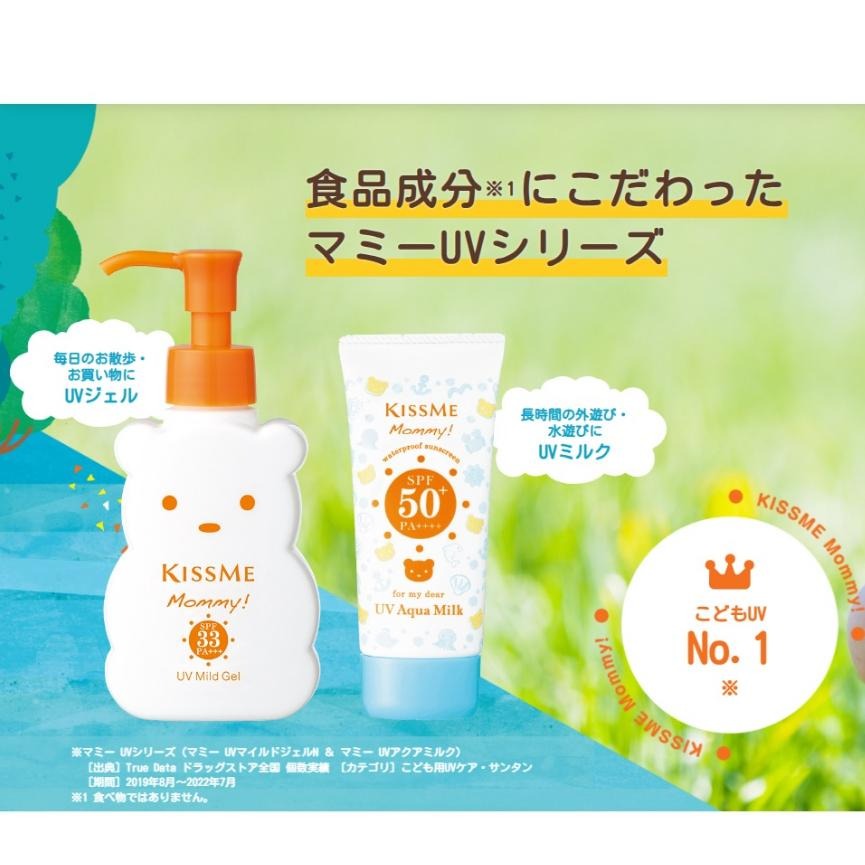 KISS ME 奇士美 Mommy UV 兒童親子防曬凝乳/防曬乳 二款 🌞小熊款 MOMMY UV親子防曬凝乳N: 100G 特性: ✨90%食品級成份 ✨SPF33 PA+++ ✨1歲幼兒以上皆可使用 ✨無添加劑: 無著色劑、無香料、無防腐劑、無礦物油、無酒精。 ✨防曬乳屬於低過敏性及弱酸性,幼童使用很溫和。 ✨含有保濕成份不緊繃 ✨凝乳型防曬霜,像水一樣易於使用不黏膩 ✨孩童及大人都可一同使用 ✨肥皂即可卸除。 ✨適用於日常走路和逛街使用 --------------------------------------------------------------------------------------------------------------------------------------------------------- 🌞防水款 MOMMY UV親子防曬乳: 50G 特性: ✨80%以上食品級成份 ✨高系數防曬 SPF50+ PA++++ ✨1歲幼兒以上皆可使用 ✨無添加劑: 無著色劑、無香料、無防腐劑、無礦物油、無酒精。 ✨防曬乳屬於低過敏性及弱酸性,幼童使用很溫和。 ✨含有保濕成份不緊繃 ✨不泛白,好推。 ✨孩童及大人都可一同使用 ✨肥皂即可卸除。 ✨適用於長時間外出,海灘游玩。防水防汗。 產地: 日本