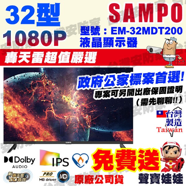 SAMPO 聲寶 32型 液晶電視 台灣製造 EM-32MDT200 顯示器 1080P FHD LED 適 PS5