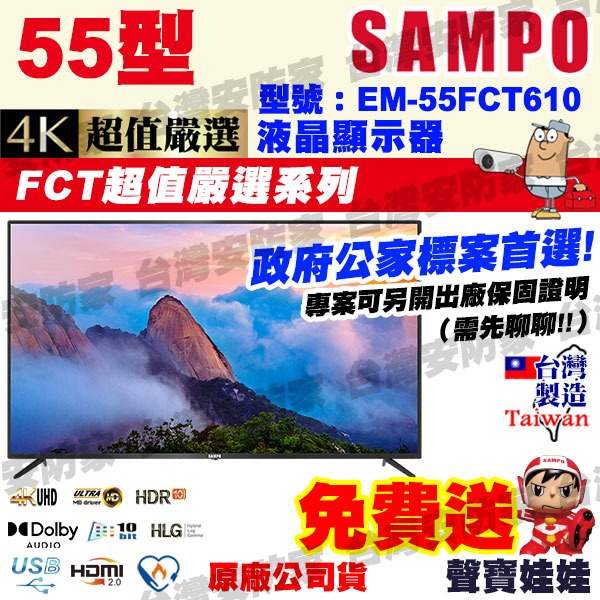 SAMPO 聲寶 液晶螢幕 55型 台灣製造 EM-55FCT610 顯示器 4K UHD LED 送 視訊盒